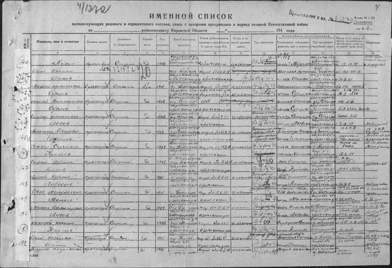 | 4308490014 | ШИШКИН Андриан Андрианович | 1905 г. р., д. Шишкины, Быстрицкого с/с, рядовой, П стр., пленен 17.07.1941 г. в г. Новгород, умер 22.11.1941 г. в к/л 310 (ХД) (Т.16.21 VI - 435). | Кировская область, Оричевский район |