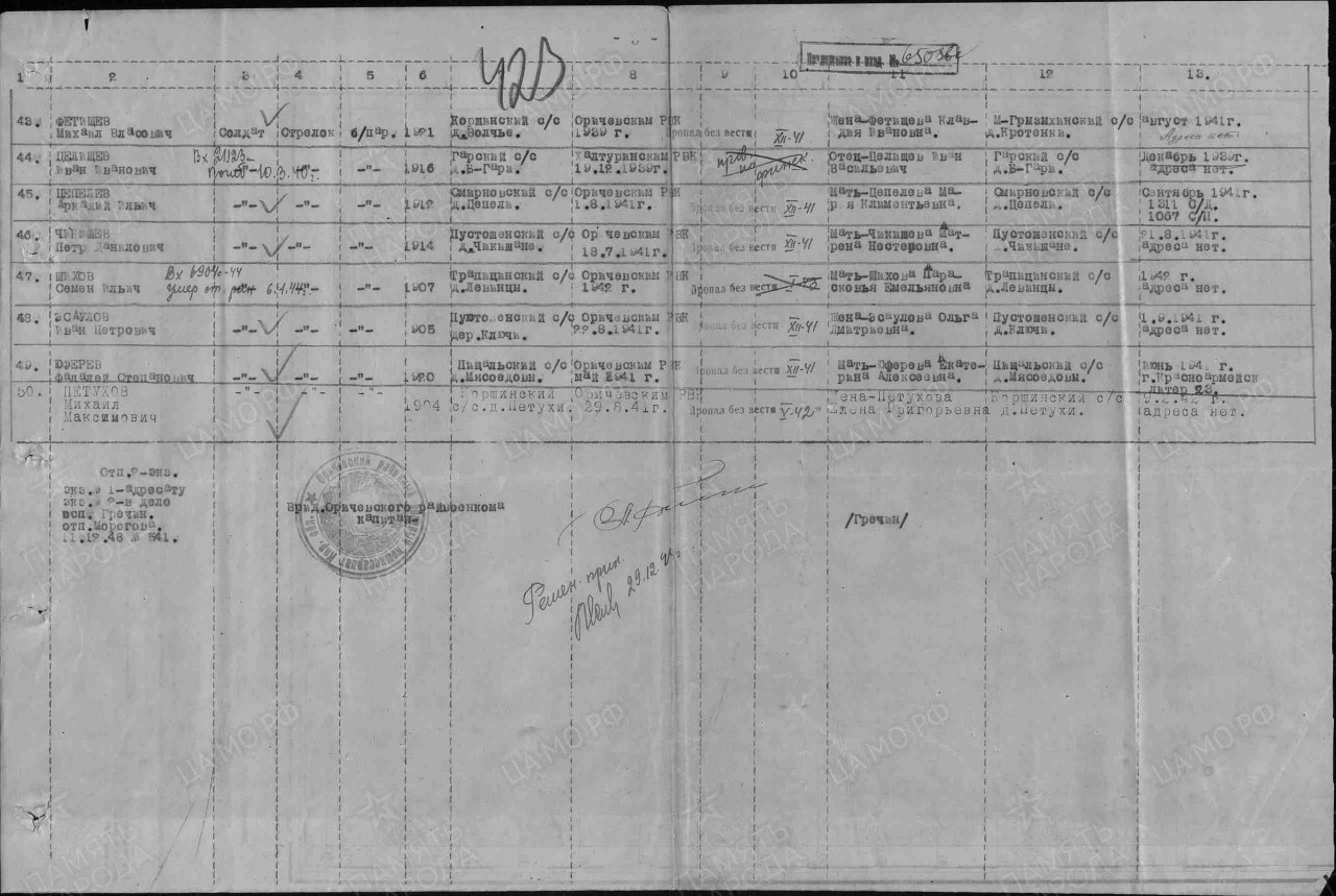 | 4308476014 | ЧИКИШЕВ Петр Данилович | 1914 г. р., д. Чикишане Пустошенского с/с, рядовой, стрелок, в декабре 1941 г. пропал без вести. | Кировская область, Оричевский район |