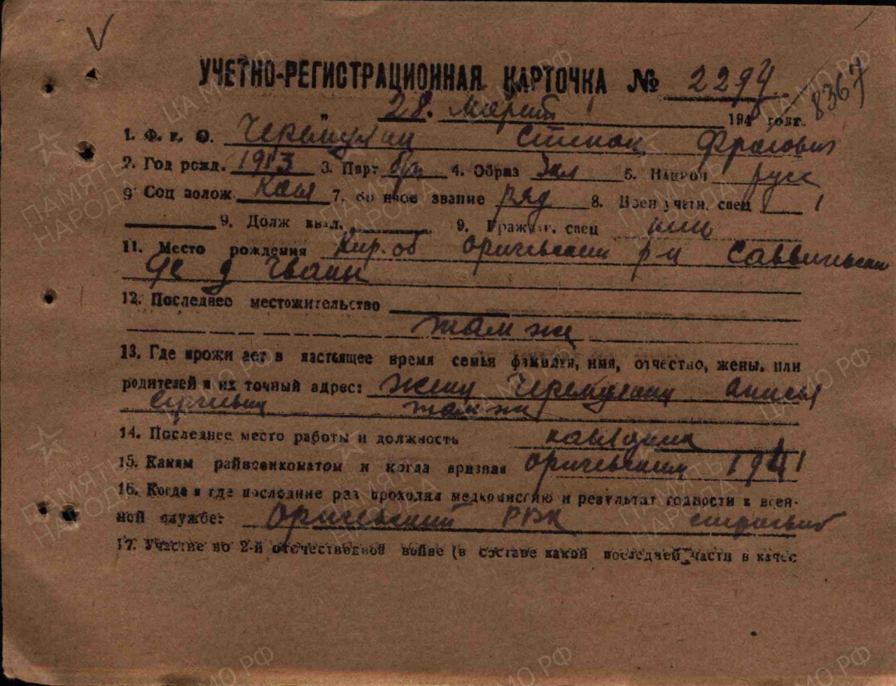 Черемухин Степан Фролович, 1913 (1908, 1915) г.р., из д. Чваны Саввичевского с/с Оричевского района. Мобилизован 18.07.1941 г. Оричевским РВК в 689 сп. Фактически: красноармеец, 1067 сп 311 сд. Ранен. Из ЭГ 1374 эвакуирован в тыл 07.09.1941 г. Из ЭГ 445 эвакуирован в тыл 17.09.1941 г. (1067 сп). Из ЭГ 3785 выбыл в отпуск 09(10).12.1941 г. Вновь призван Оричевским РВК 23.03.1945 г. Кировский ВПП выбыл 31.03.1945 г. в Б-ОИТК. Награды: орден Отечественной войны II степени (1985 г.)( год рождения указан - 1915).