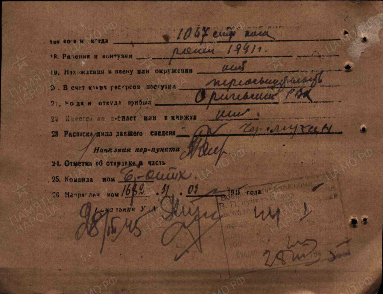 Источники информации: Алфавитная книга призванных по мобилизации в период Великой Отечественной войны Оричевским РВК Кировской области на «Х, Ц, Ч», листы 38 об, 39, № 68; Филиал ЦАМО (Архив военно-медицинских документов). Картотека: Ленинградская картотека. 1941-1942 гг, Картотека общего учета, Картотека общего учета. Фонд: Картотека ранений. Опись: Ленинградская картотека. 1941-1942 гг, Картотека общего учета, Картотека общего учета. Номер ящика: 272-15, 055-22; ЦАМО. Фонд: Кировский ВПП. Опись: 172205. Дело: 43454; Юбилейная картотека награждений. Расположение документа: шкаф 60, ящик 42)