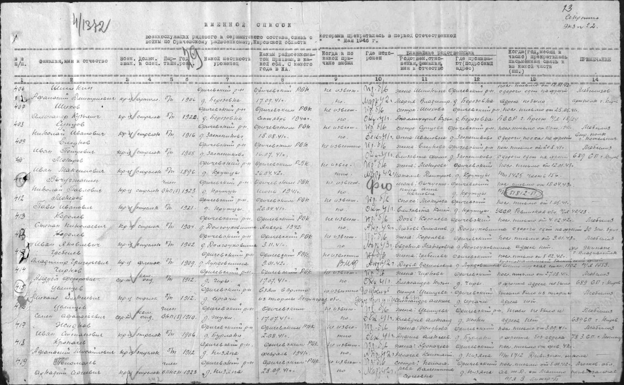 | 4319069008 | ЧИРКОВ Андрей Фёдорович | 1912 г.р., Саввичевский с/с, д. Чиры. Сержант, командир отделения. Пропал без вести в октябре 1941 года. [Боец 689 сп 411 сд] | Кировская область, Оричевский район |