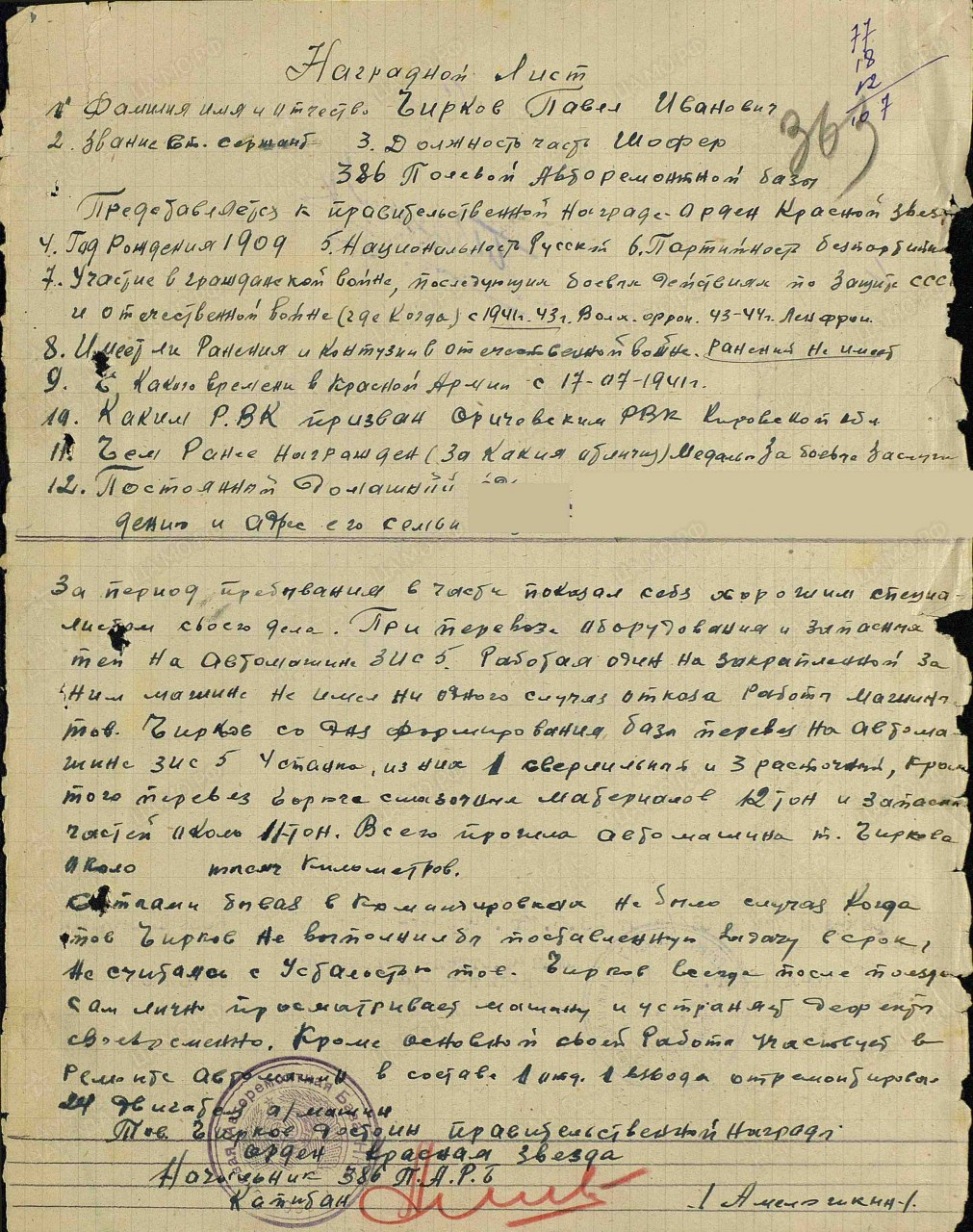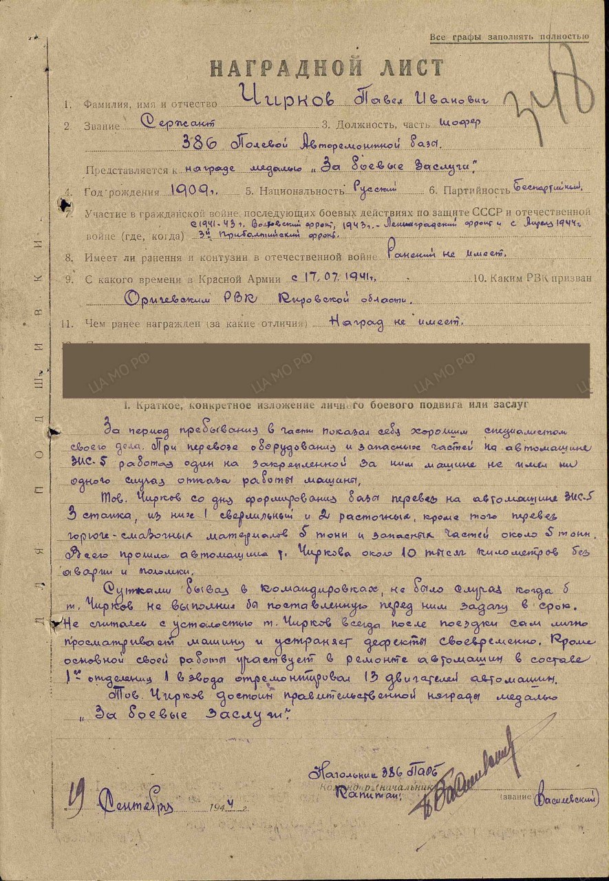 Чирков Павел Иванович, 1909 г.р., уроженец Халтуринского р-на Кировской области. До мобилизации работал шофером и проживал в д. Замятины Трапицынского с/с Оричевского района. Мобилизован 18.07.1941 г. Оричевским РВК в 689 сп. Фактически: младший командир (ВУС-5), 1067 сп 311 сд (предполагается). Красноармеец, 1069 сп 311 сд (с 20.10.1942 г. по 10.02.1943 г.). Сержант, шофер, 386 полевая авторемонтная база. Награды: Медаль «За боевые заслуги» (две), орден Отечественной войны II степени (1985 г.)(не точно, нет достаточных данных)