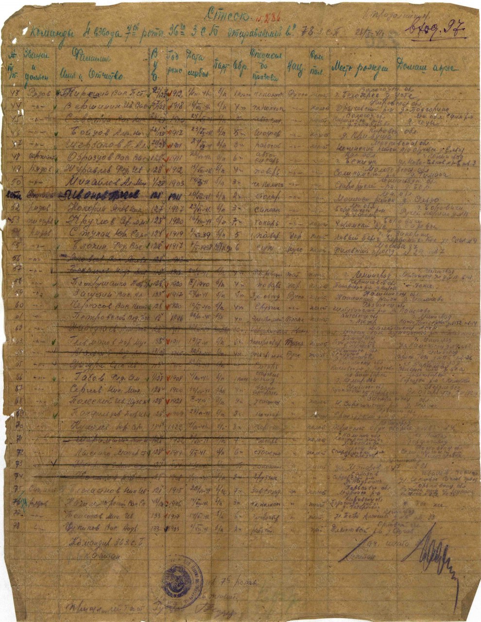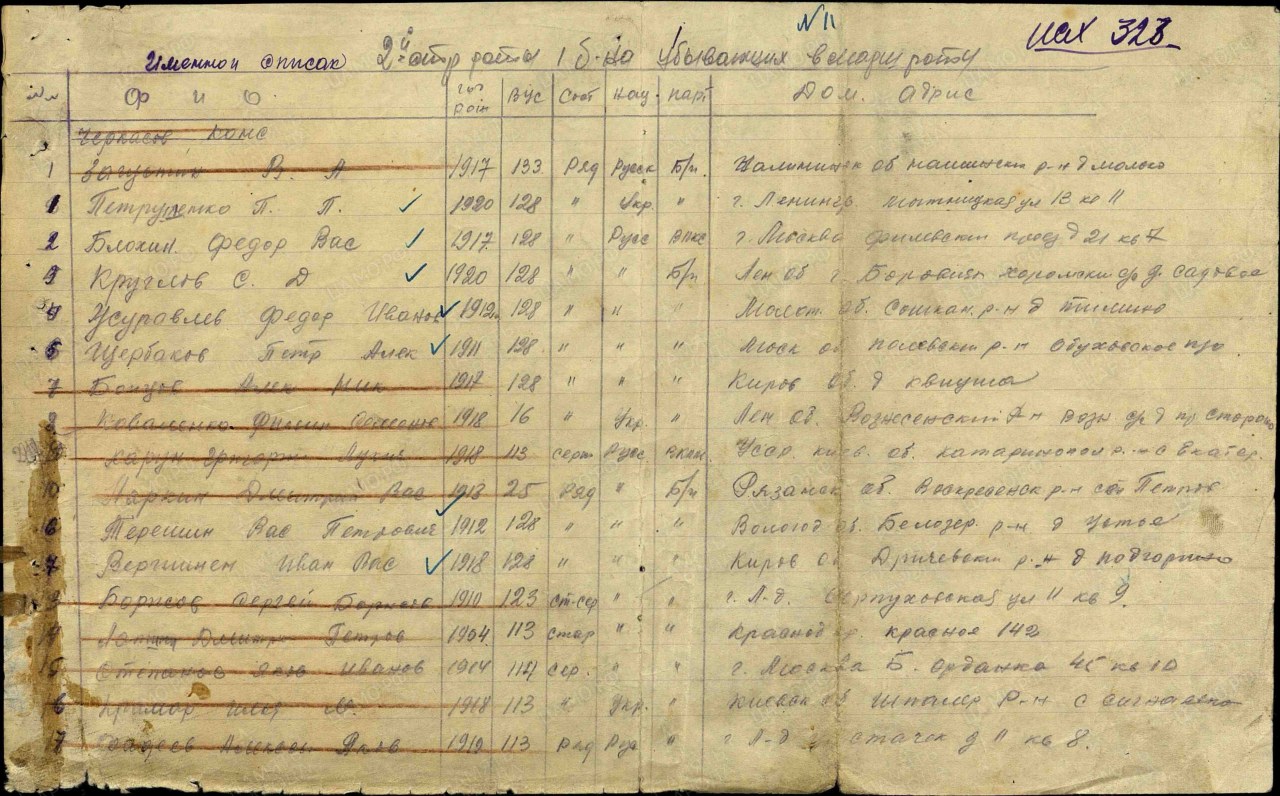 Вершинин Иван Васильевич, 1918 г.р., из д. Подгоряна Пищальского с/с Оричевского района. Мобилизован 18.07.1941 г. Оричевским РВК в команду 903. Фактически: красноармеец, рядовой (ВУС-67), 311 сд (предполагается). 286 сп. Ранен. Выбыл 04.09.141 г. из СЭГ 1170 в госпиталь 1449. 36 зсбр, 78 зсп (до 30.09.1941 г.). 402 ксп 168 сд. Погиб 13.10.1941 г. Первичное место захоронения: Ленинградская обл., Всеволожский р-н, д. Московская Дубровка. Место захоронения: Всеволожский р-н, г.п. Дубровское, п. Дубровка, севернее, 2 км, монумент "Часовня"