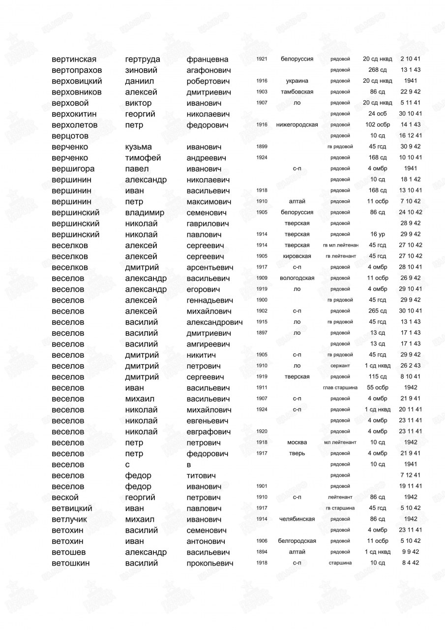| 4308297011 | ВЕРШИНИН Иван Васильевич | 1918 г. р., д. Подгоряна Пищальского с/с, красноармеец, рядовой 102 краснознам. сп, 12.10.1941 г. убит. Захоронен в Ленинградской обл., д. Московская Дубровка. | Кировская область, Оричевский район |