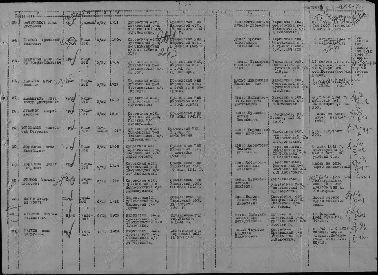 Овчинников Иван Егорович, 1911 г.р., из д. Головинцы Шалеговского с/с Оричевского района. Мобилизован 18.07.1941 г. Оричевским РВК в 689 сп. Фактически: красноармеец, 8 рота 3-го батальона 1067 сп 311 сд. Последнее письмо 11.08.1941 г. Адрес - п/п 775, 311 дивизия, 1067 стр. полк, 3 бат. 8 рота. Считается пропавшим без вести в декабре 1941 г.