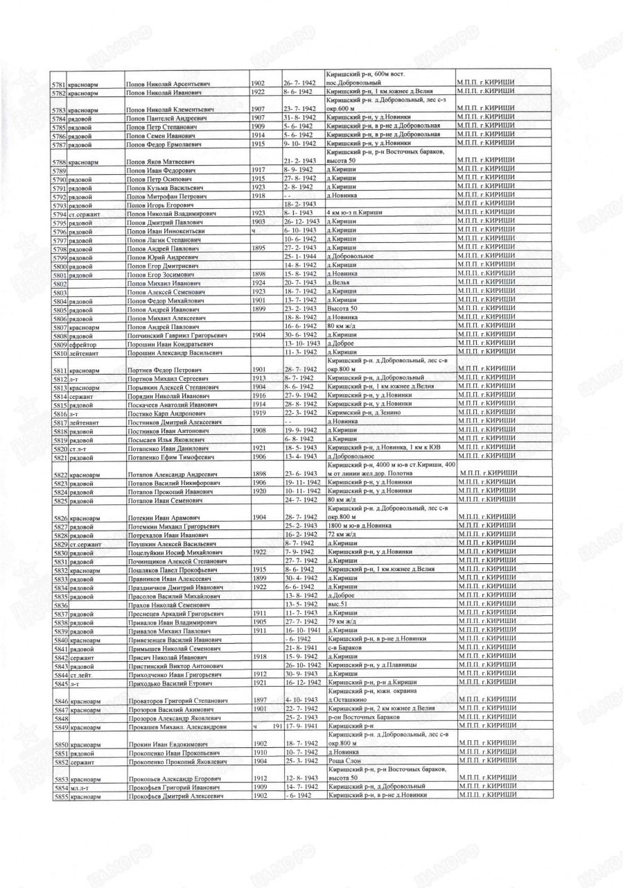 | 4308405020 | ПЕРЕВАЛОВ Михаил Павлович | 1911 г. р., д. Карапины Пустошенского с/с, солдат, рядовой НКВД, 1067 сп. 16.10.1941 года погиб в бою. Захоронен в Ленинградской области, Киришский район. | Кировская область, Оричевский район |