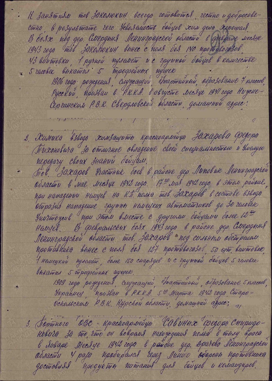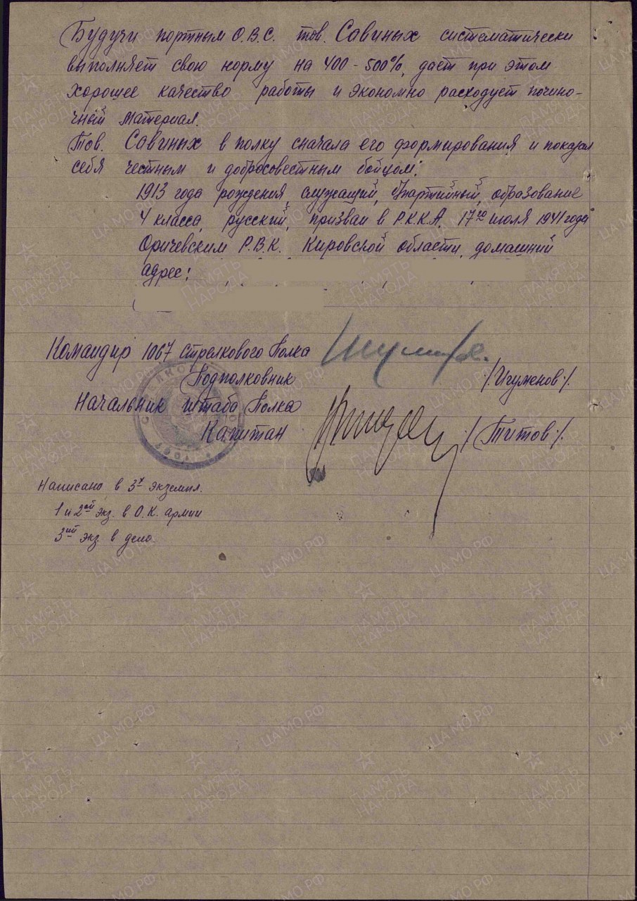 Савиных Фёдор Спиридонович, 1913 г.р., из д. Коробейники Пищальского с/с Оричевского района. Член ВЛКСМ. Мобилизован 18.07.1941 г. Оричевским РВК в 689 сп. Фактически: красноармеец, ефрейтор, портной ОВС, 1067 сп 311 сд. Награды: медали "За боевые заслуги", "За отвагу", «За оборону Ленинграда».