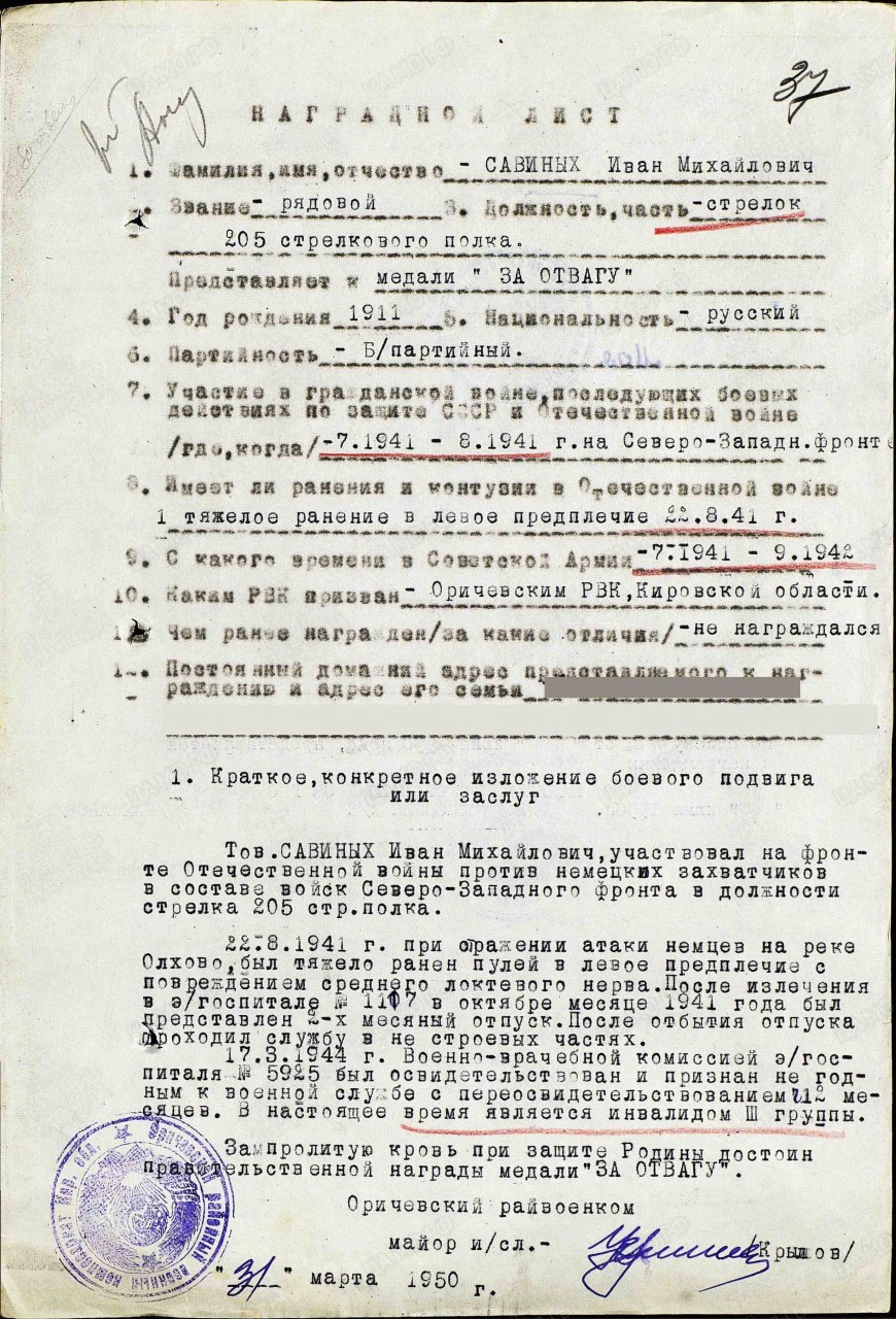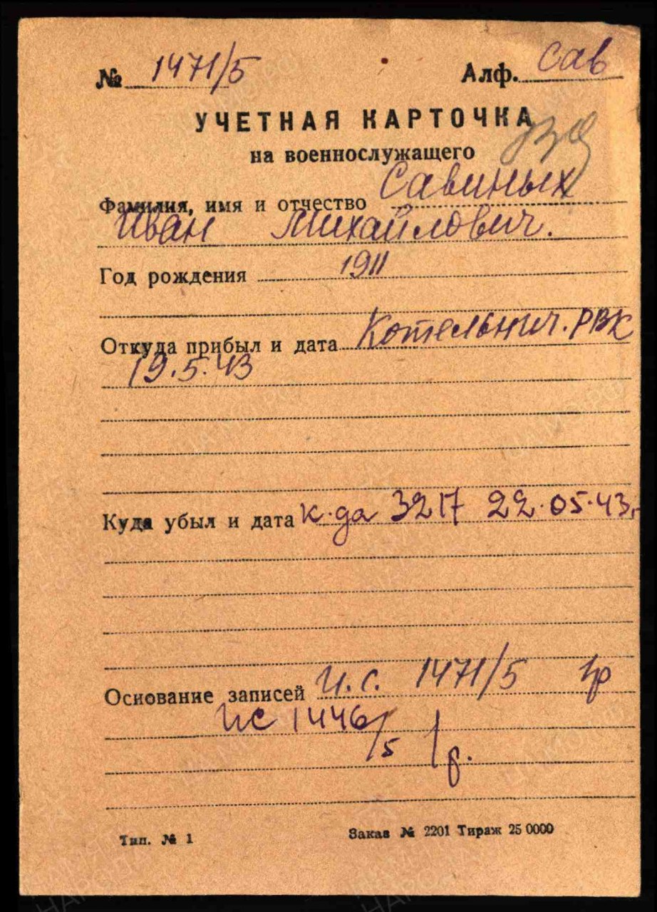 Савиных Иван Михайлович, 1911 г.р., из д. Коробейники Пищальского с/с Оричевского района. Мобилизован 18.07.1941 г. Оричевским РВК в 689 сп. Фактически: красноармеец, 311 сд (предполагается). Тяжело ранен 22.08.1941 г. при обороне на реке "Олхово" (Волхов). Посли излечения и отпуска вновь призван Оричевским РВК 30.04.1943 г. в ПП г. Котельнич. 36 зсбр (с 19.05. до 22.05.1943 г.). 63 сп, 205 сп, 25 ОРОАБ (до 03.01.1944 г.). выбыл из ЭГ 2222 в госпиталь 1117. Из ЭГ1117 эвакуирован 22.02.1044 г. в тыл. 17.03.1944 г. признан негодным к военной службе. Инвалид Отечественной войны. Награды: медаль "За отвагу", орден Отечественной войны II степени (1985 г.).