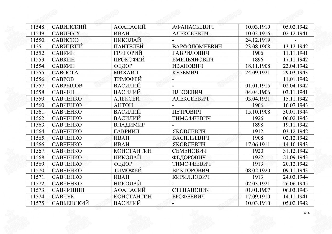 Савиных Иван Алексеевич, 1916 г.р., из д. Паньшины Пищальского с/с Оричевского района. Мобилизован 18.07.1941 г. Оричевским РВК в 689 сп. Фактически: красноармеец, 1067 сп 311 сд. Попал в плен. Погиб в плену 02.12.1941 г. Лагерь: шталаг VI K (326). Лагерный номер: 13822. Место захоронения: Фореллькруг/Сенне. Страна захоронения: ФРГ. Регион захоронения: Земля Северный Рейн-Вестфалия. Место захоронения: административный округ Гютерсло, г. Шлосс Хольте-Штукенброк, 33758, ул. Зеннер Штрассе. Захоронение: 1151376261