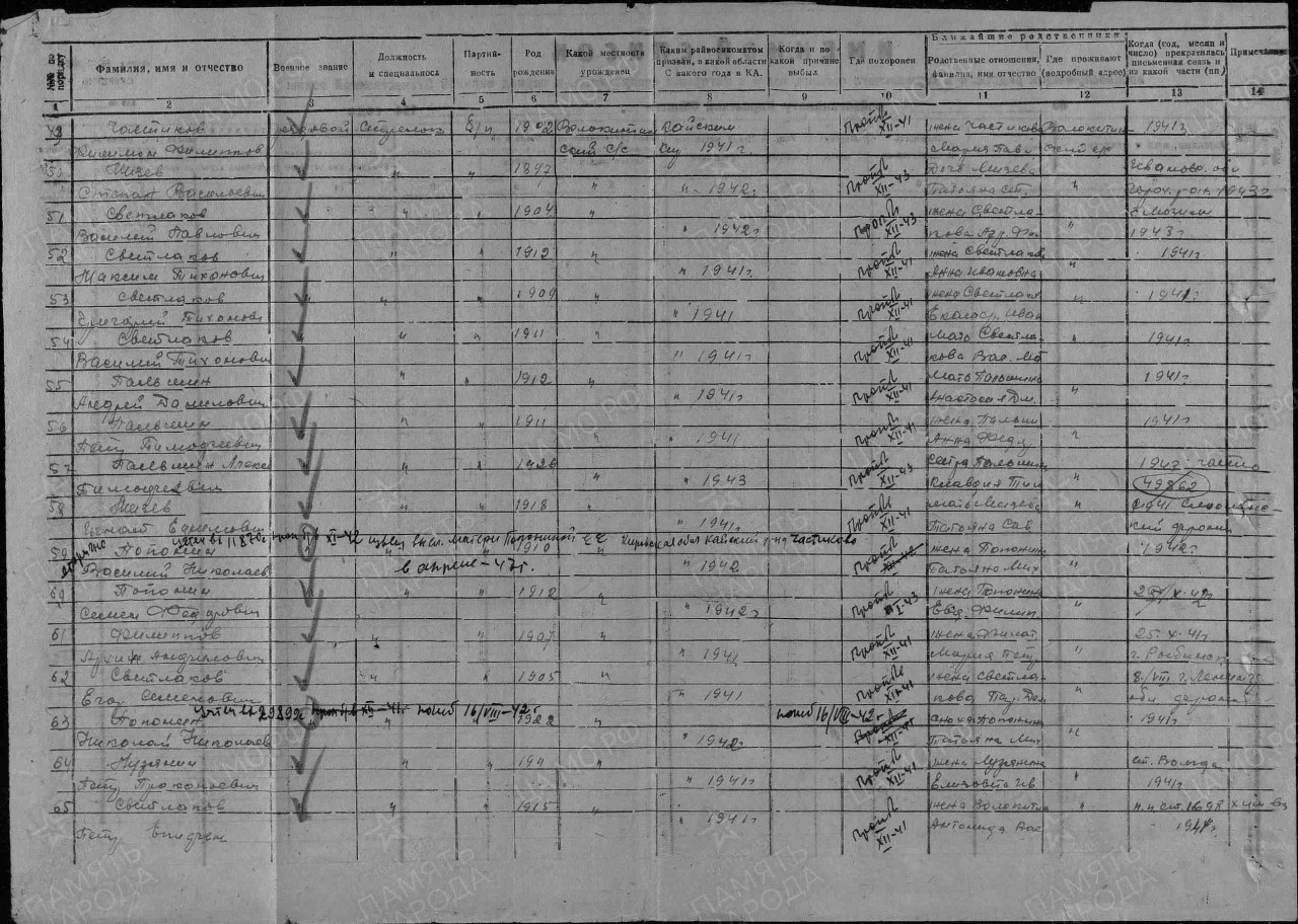 | 4302316019 | СВЕТЛАКОВ Василий Павлович | род. в 1904 г., из Волокитинского с/с, призван Кайским РВК, рядовой, стрелок, пропал без вести в декабре 1943 г. | Кировская область, Верхнекамский район |