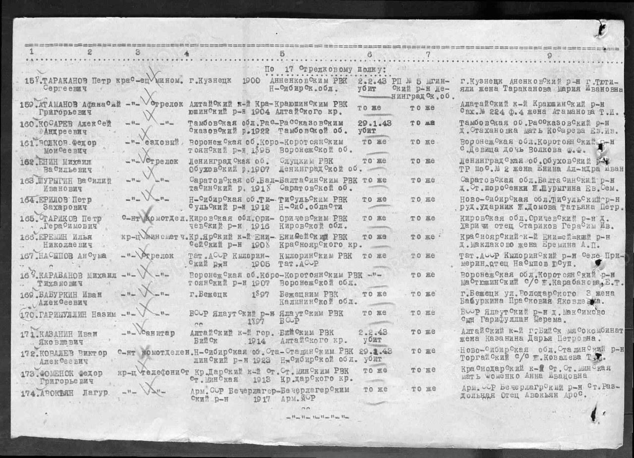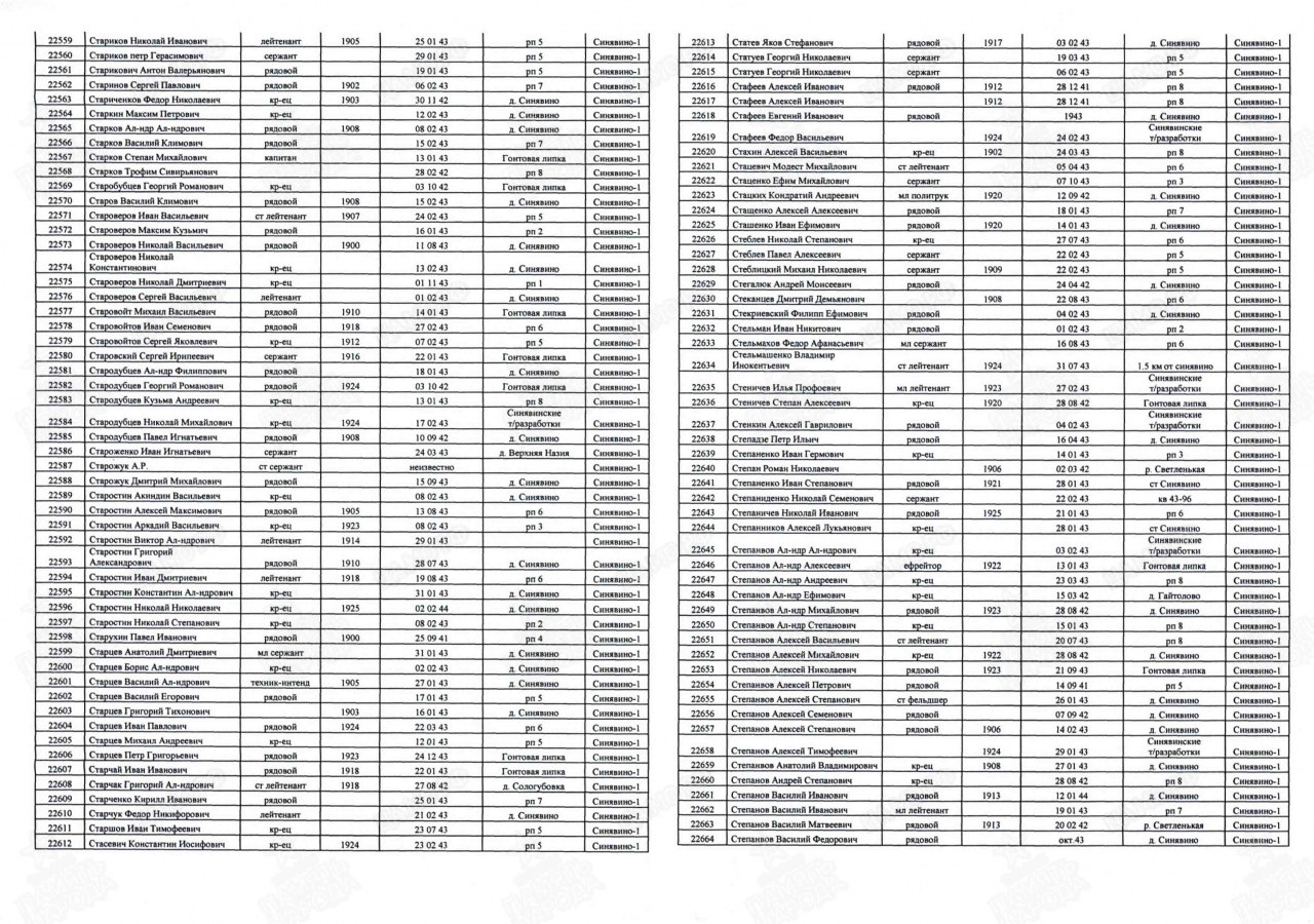 | 4308452008 | СТАРИКОВ Петр Герасимович | 1916 г. р., д. Харичи Пищальского с/с, сержант, ком. отд., 17 сп, 239 сд, 29.01.1943 г. погиб в бою. Захоронен в Ленинградской обл., Мгинский р-н, пос. 5. | Кировская область, Оричевский район |
