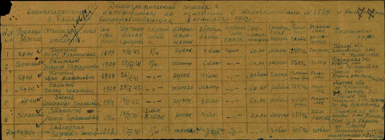 Стариков Пётр Герасимович, 1916 г.р., из д. Харичи Пищальского с/с Оричевского района. Член ВЛКСМ. Мобилизован 18.07.1941 г. Оричевским РВК в 689 сп. Фактически: красноармеец, 1067 сп 311 сд. Ранен. Выбыл 06.10.1941 г. из ЭГ 3129 в 27 зсп. Красноармеец, 945 сп 262 сд. Пропал без вести 11.12.1941 г. в Калинской области. Выбыл 01.01.1942 г. из ППГ 502 в ВСП 1042. Сержант, 473 сп. Из ЭГ 1379 прибыл 18.09.1942 г. в БВ 206 фзсп. Сержант, ком. отделения, 817 сп 239 сд. Погиб 29(23).01.1943 г. Первичное место захоронения: Ленинградская обл., Мгинский р-н, р.п. № 5. Место захоронения: Кировский р-н, г.п. Синявино, ул. Песочная. Откуда перезахоронен: р.п. 5