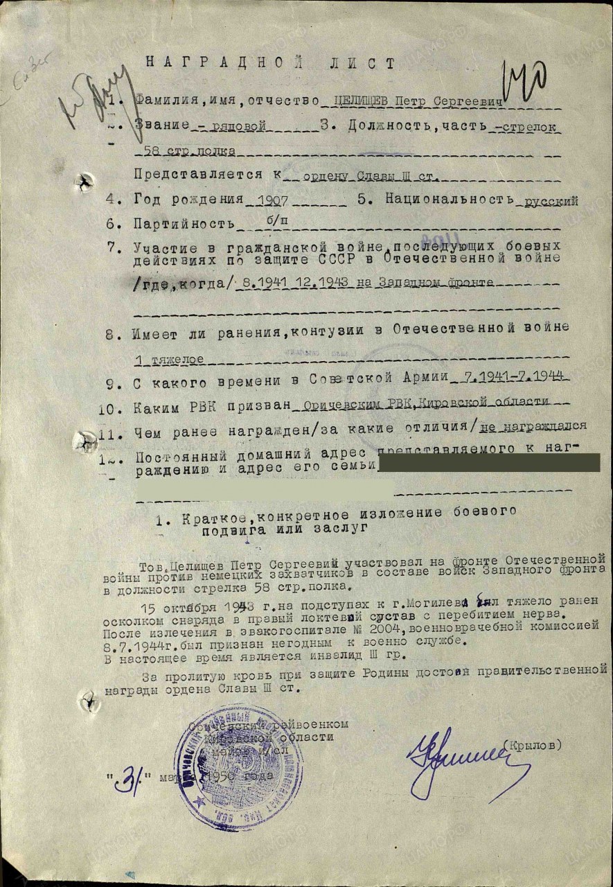 Целищев Пётр Сергеевич, 1907 г.р., из д. Большие Гари Гарского с/с Оричевского района. Мобилизован 18.07.1941 г. Оричевским РВК в 689 сп. Фактически: красноармеец, 2-й батальон, 1067 сп 311 сд (принял присягу 24.07.1941 г. в г. Кирове). 58 сп, 451 сп. Тяжело ранен 15.10.1943. Из ЭГ 1814 эвакуирован в тыл 06.02.1944 г. Признан негодным к службе (451 сп) 24.06.1944 ЭГ 2004 Инвалид III гр. Награды: орден Славы III степени (1951 г.).