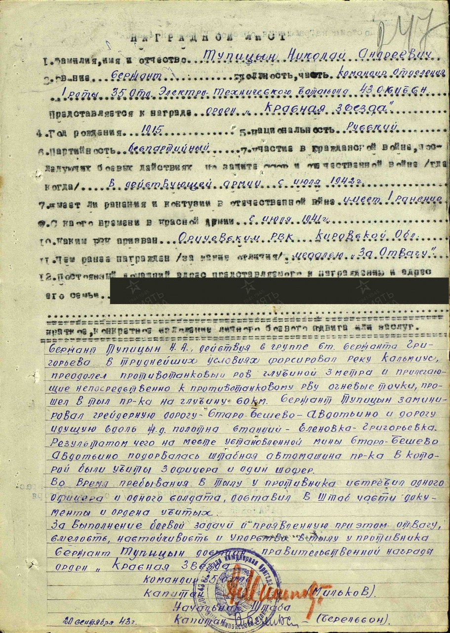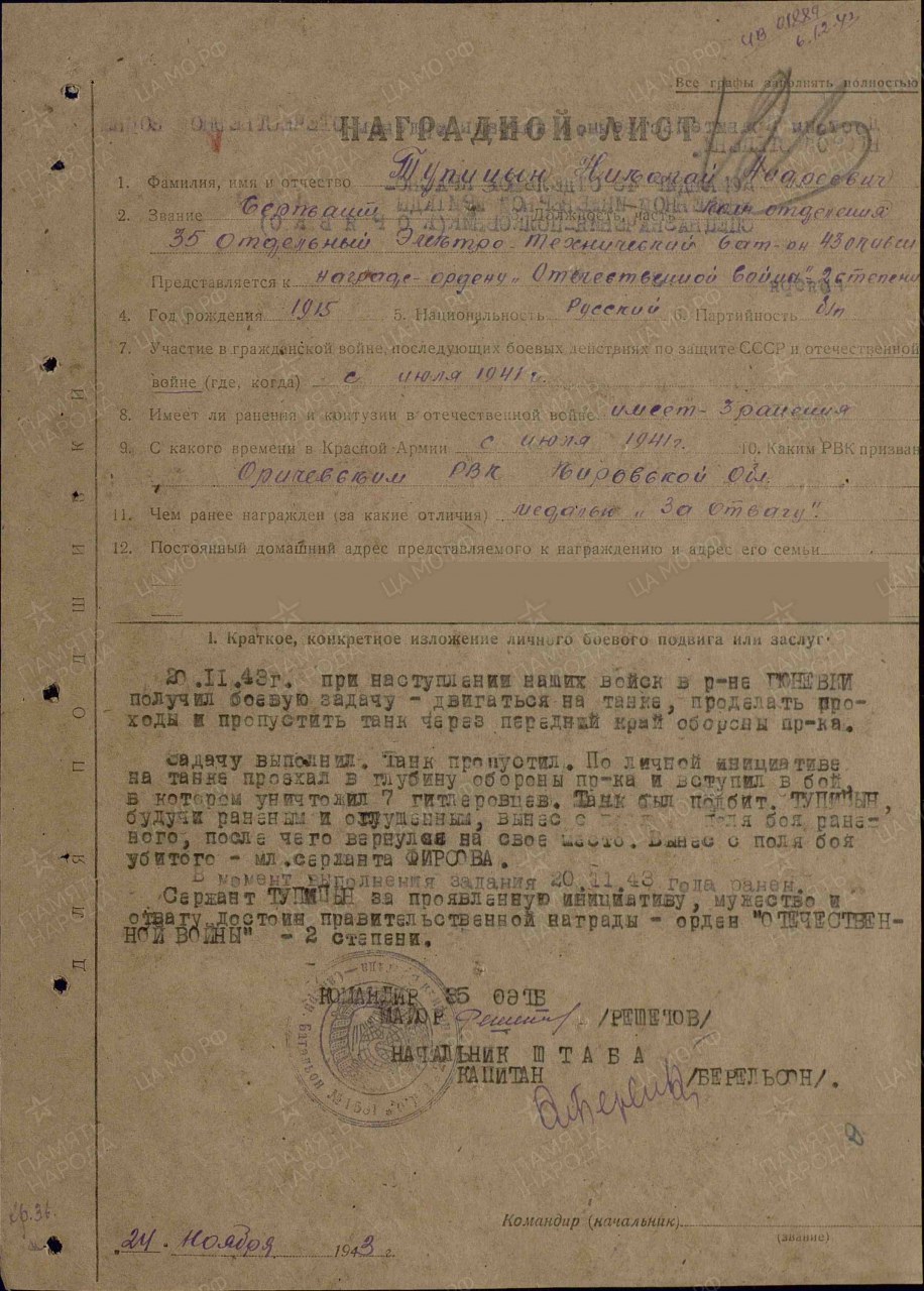 Тупицын (Тупицин) Николай Андреевич, 1915 г.р., из д. Тупицыны Истобенского Оричевского района. Мобилизован 18.07.1941 г. Оричевским РВК в 689 сп. Фактически: младший командир, 311 сд (предполагается). 1404 сб 19 сб (с 15.08.- 28.10.1942 г.), 7 исбр (до 28.10.1942 г.). Сержант, ком отделения, 35 отдельный электротехнический батальон 43 исбрсн (с 28.10.1942 г.). Сержант, 108 омшисб (до 15.08.1944 г. или 12.09.1944 г.). Ранен. ЭГ 4854. 19 сбр, 23 мшисбр. Умер от ран в госпитале 20.06.1945 г. Первичное место захоронения: Похоронен: братская могила на Глуховском кладбище в г. Ногинске. Награды: медали "За отвагу", "За оборону Сталинграда", ордена Красной Звезды, Славы III степени.