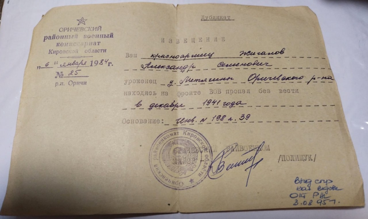 Жигалов Александр Семенович, 1904 г.р., из д. Летягины Чуркинского с/с Оричевского р-на. Мобилизован 04(02).09.1941 г. Оричевский РВК в 36 сп (г. Ижевск). Последнее письмо от 25.09.1941 г. Считается пропавшим без вести в декабре 1941 г. Выписка из письма: "... внастоящее время находимся в дороге. Нас обмундировали 18 сентября, а погрузились 23 сентября в ученее у нас вышло 10 дней так что учат только поверхность. Едем на Москву. Едем все вместе. Но незнаем куда нас привезут..." (стиль письма постарался сохранить).