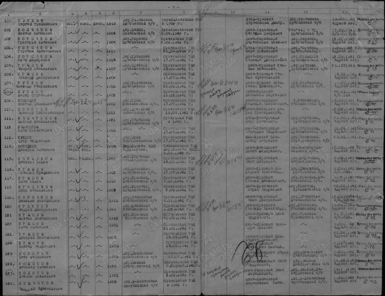 | 4308339018 | КАЗАРИНОВ Иван Николаевич | 1913 г. р., д. Карапины, Пустошенского с/с, рядовой, в декабре 1941 г. пропал без вести. | Кировская область, Оричевский район |
