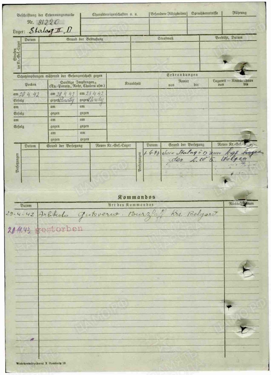 Мухачев Георгий (Егор) Кузьмич, 1914 г.р., уроженец д. Высоково Верхошижемского района. До мобилизации жил в д. Большие Короли и работал в с. Шалегово Шалеговского с/с (плотницкие работы в колхозах и у граждан). Мобилизован 18.07.1941 г. Оричевским РВК в 689 сп. Фактически: красноармеец, 1067 сп 311 сд (принял присягу 24.07.1941 г. в г. Кирове). Данных о письмах нет. Считается пропавшим без вести в декабре 1941 г. Попал в плен 27.08.1941 г. в районе Тосно. Лагерь: шталаг II D. Лагерный номер: 81220. Погиб в плену 20.11.1943 г.