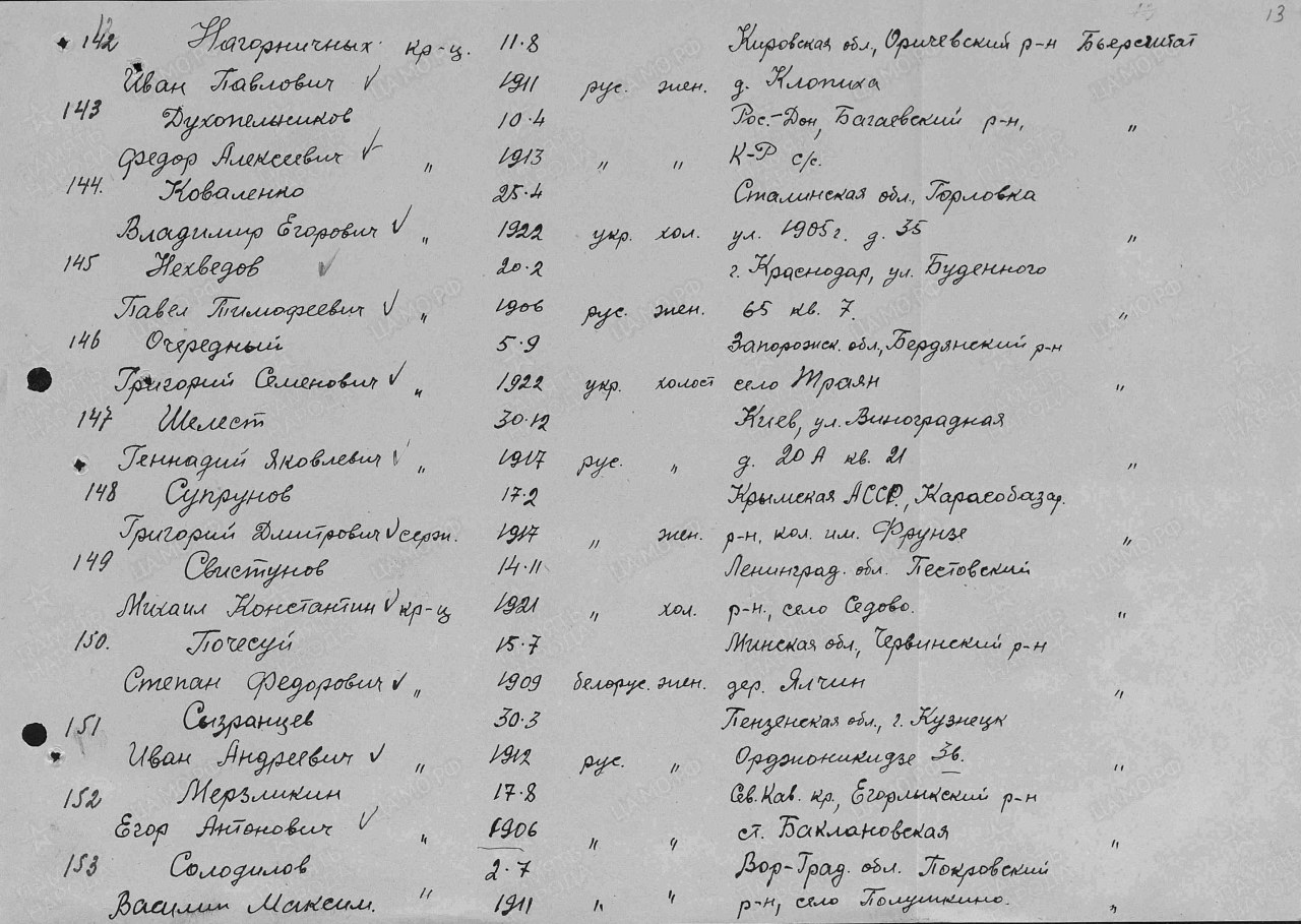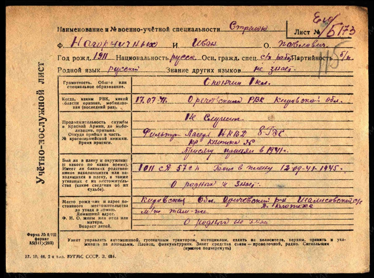 Нагорничных Иван Павлович, 1911 г.р., из д. Клопиха Шалеговского с/с Оричевского района. Мобилизован 18.07.1941 г. Оричевским РВК в 689 сп. Фактически: красноармеец, 1067 сп 311 сд (предполагается). Попал в плен 12.09.1941 г. Освобожден в 1945 г. американскими войсками. Репатриант. ПФЛ НКВД 8 ГЭС выбыл в ПРБ 36 зсд (08.09.45 г.).