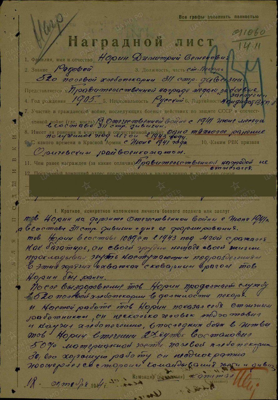 Норин Дмитрий Семенович, 1905 г.р., из д. Малые Норинцы Норинского с/с Оричевского района. Мобилизован 23.07.1941 г. Оричевским РВК в хлебозавод (г. Киров). Фактически: красноармеец, хлебопек, 443 пхп, старший пекарь, 520 полевая хлебопекарня, 311 сд. Тажело ранен под Мгой в 1943 г. награда: медали "За боевые заслуги", "За оборону Ленинграда".