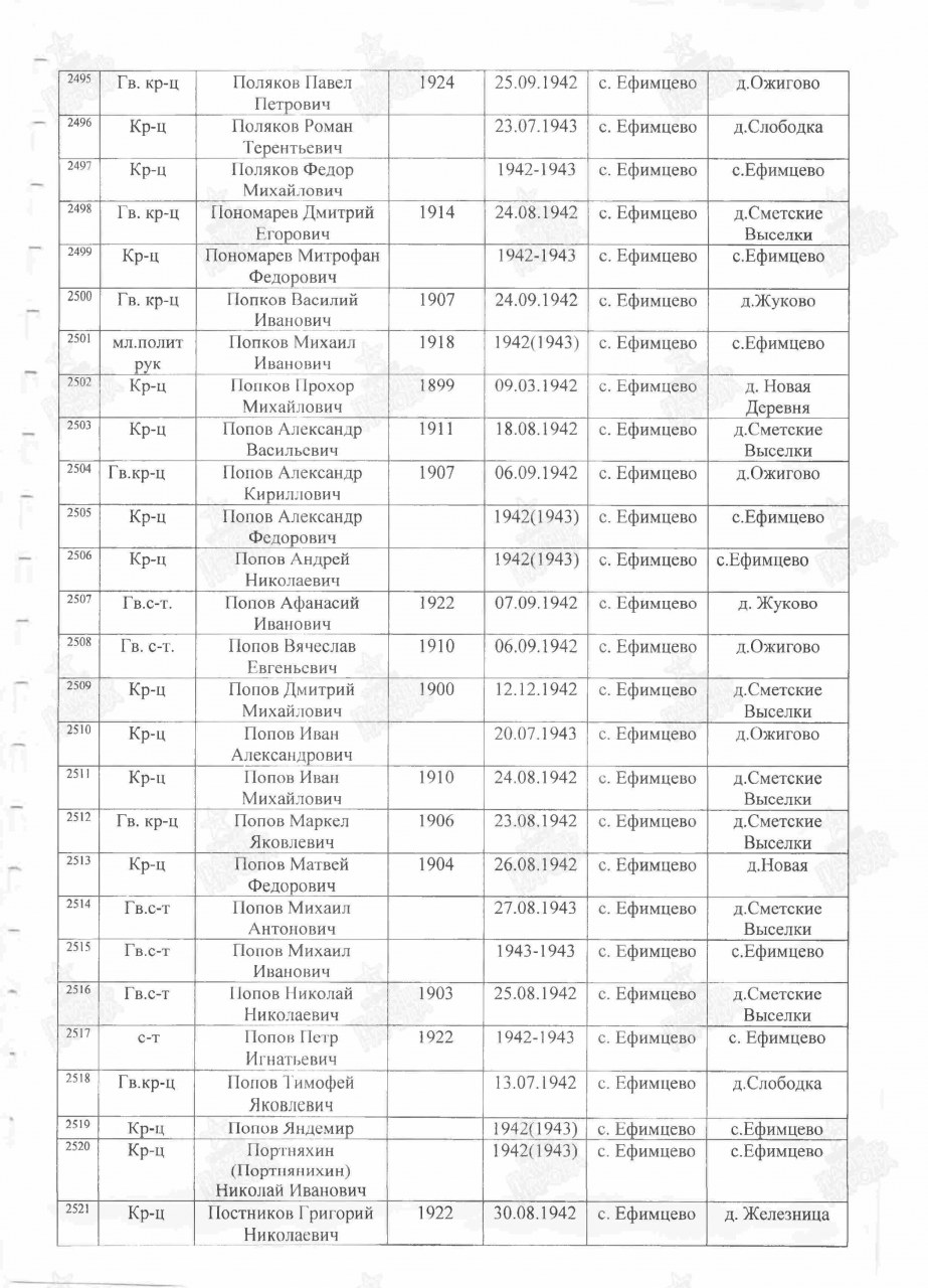 Попов Александр Васильевич, 1911 г.р., из д. Малая Грызиха Мало-Грызихинского с/с Оричевского района. Мобилизован 18.07.1941 г. Оричевским РВК в 689 сп. Фактически: красноармеец, 1067 сп 311 сд (принял присягу 24.07.1941 г. в г. Кирове). Красноармеец, минометчик, отдельная минометная рота 105 сбр. Погиб 18.08.1942 г. Первичное место захоронения: Орловская обл., Ульяновский р-н, д. Сметские Выселки, юго-восточнее, 400 м. Место захоронения: Калужская область, Ульяновский р-н, с.п. "Село Волосово-Дудино", с. Ефимцево. Откуда перезахоронен: д. Сметские Выселки.
