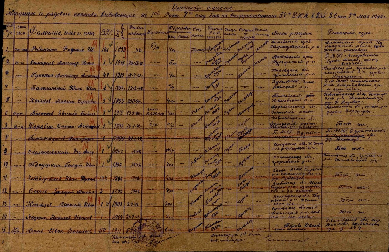 Русских Александр Александрович, 1910 г.р., из д. Русские Вальковского с/с Оричевского района. Мобилизован 18.07.1941 г. Оричевским РВК в 689 сп. Фактически: красаноармеец (ВУС-45), радиотелеграфист, 311 сд (предполагается). Красноармеец, связист (ВУС-48), ВПП 225 азсп 54 А (7 отд. Батальон выздоравливающих). Выбыл 20.09.1942 в 80 сд. Последнее письмо 15.03.1943, адрес не известен. Считается пропавшим без вести в мае 1943 г.