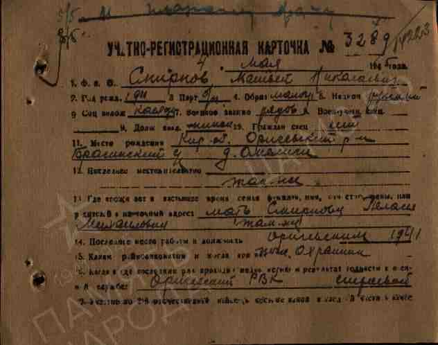 Смирнов Матвей Николаевич, 1911 г.р., из д. Омеличи Брагинского с/с Оричевского района. Мобилизован 18.07.1941 г. Оричевским РВК в 689 сп. Фактически: красноармеец (ВУС-5), 1067 сп 311 сд (принял присягу 24.07.1941 г. в г. Кирове). Кировский ВПП 10.05.1945 г.