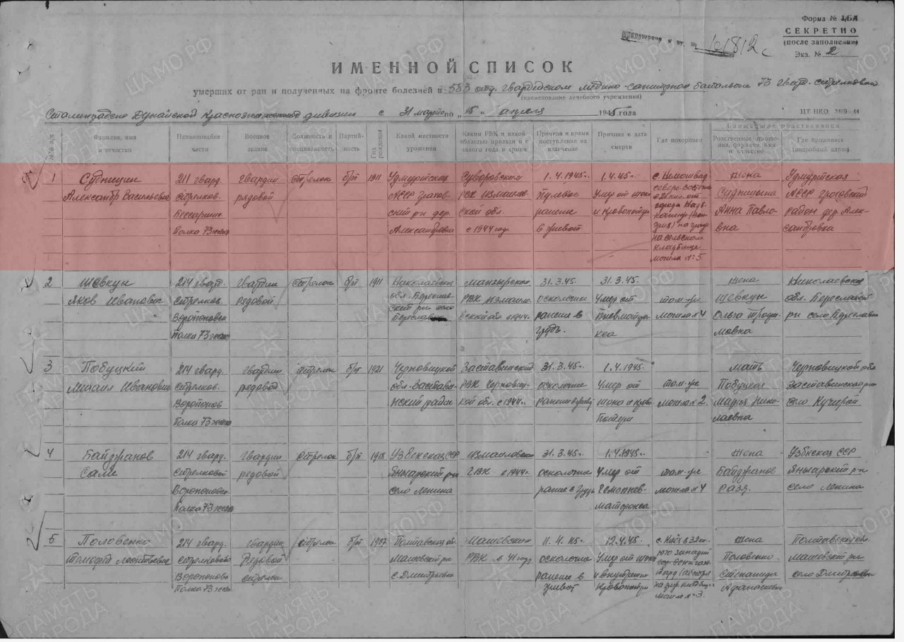 | Погиб | 01.04.1945 | Пулевое ранение в живот, умер от кровопотери 01.04.1945 г. Похоронен Венгрия, г. Надькашюр, северо-восточнее, 21 км, с.Немошвад, гражданское сельское кладбище, могила № 5. |