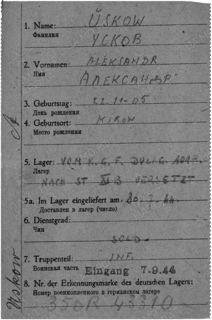 Усков Александр Ильич, 1905 г.р., из д. Большое Шипаково Пустошенского с/с Оричевского района Кировской области. Мобилизован 18.07.1941 г. Оричевским РВК в 689 сп. Фактически: красноармеец (ВУС-5), 1067 сп 311 сд (принял присягу 24.07.1941 г. в г. Кирове). Последнее письмо от 18.08.1941 г. Попал в плен 25.08.1941 г. под Чудово. Лагерь: шталаг 350/шталаг XI B. Лагерный номер: 43310 (последние сведения от 02.11.1944 г.). Считается пропавшим без вести в декабре 1941 г.