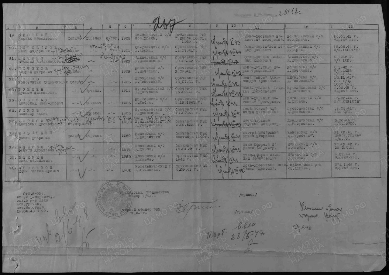 | 4308461024 | УСКОВ Александр Ильич | 1905 г. р., из д.Шипаково Пустошенского с/с, солдат, рядовой, в декабре 1941 г. пропал без вести. | Кировская область, Оричевский район | |||