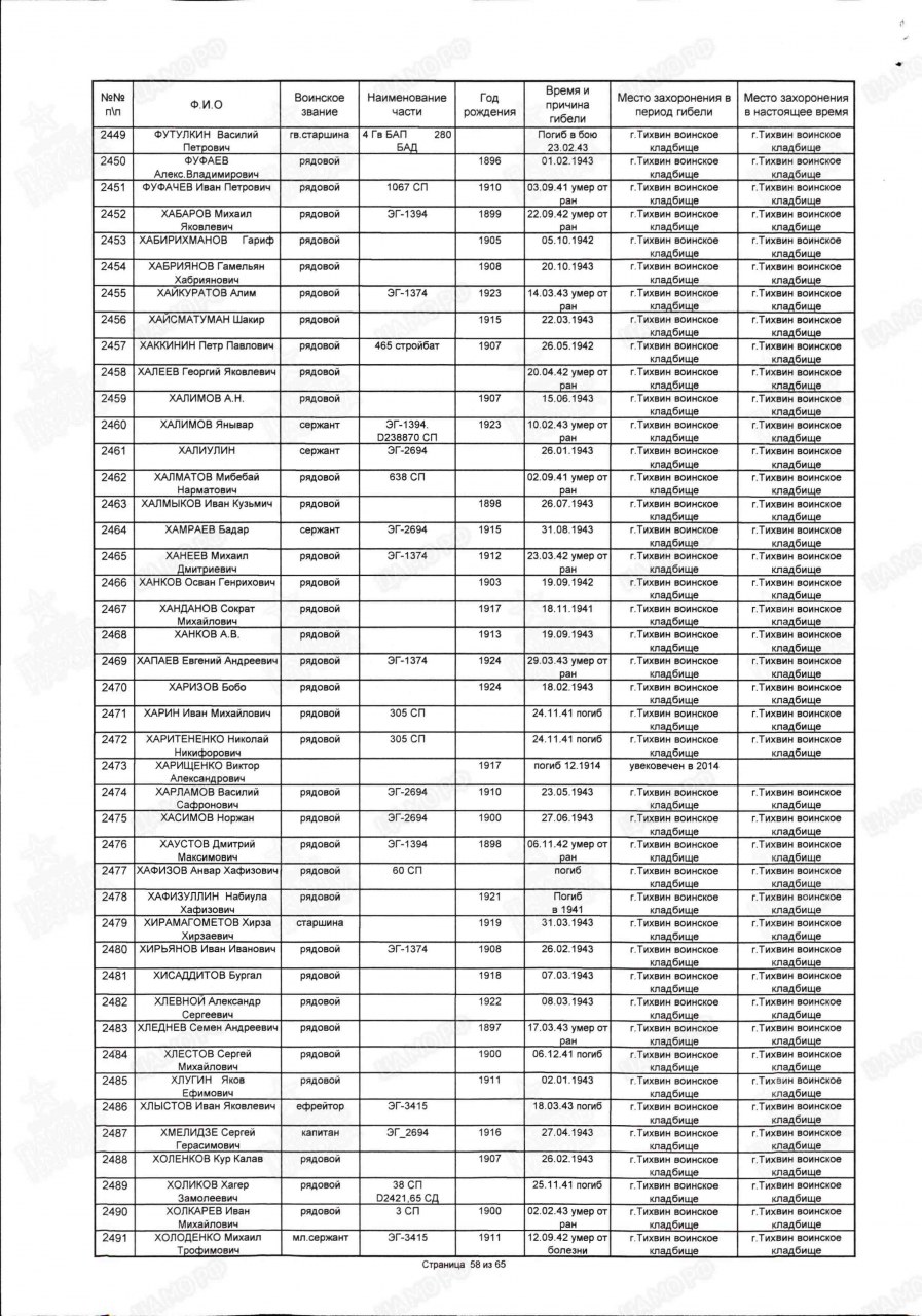| 4308466009 | ФУФАЧЕВ Иван Петрович | 1908 г. р., д. Липицы Быстрицкого с/с, красноармеец, 1067 сп, 31.09.1941 г. умер от ран. Захоронен в Ленинградской обл., Тихвинское кладбище, г. Тихвин. Комментарий: В соответствии с документами о безвозвратных потерях правильная дата смерти - 03.09.1941 г. | Кировская область, Оричевский район |