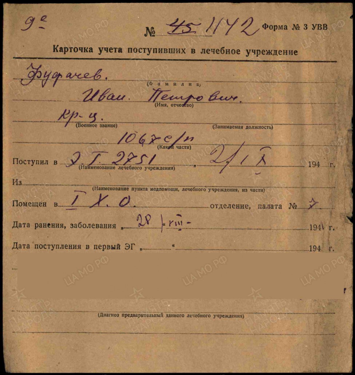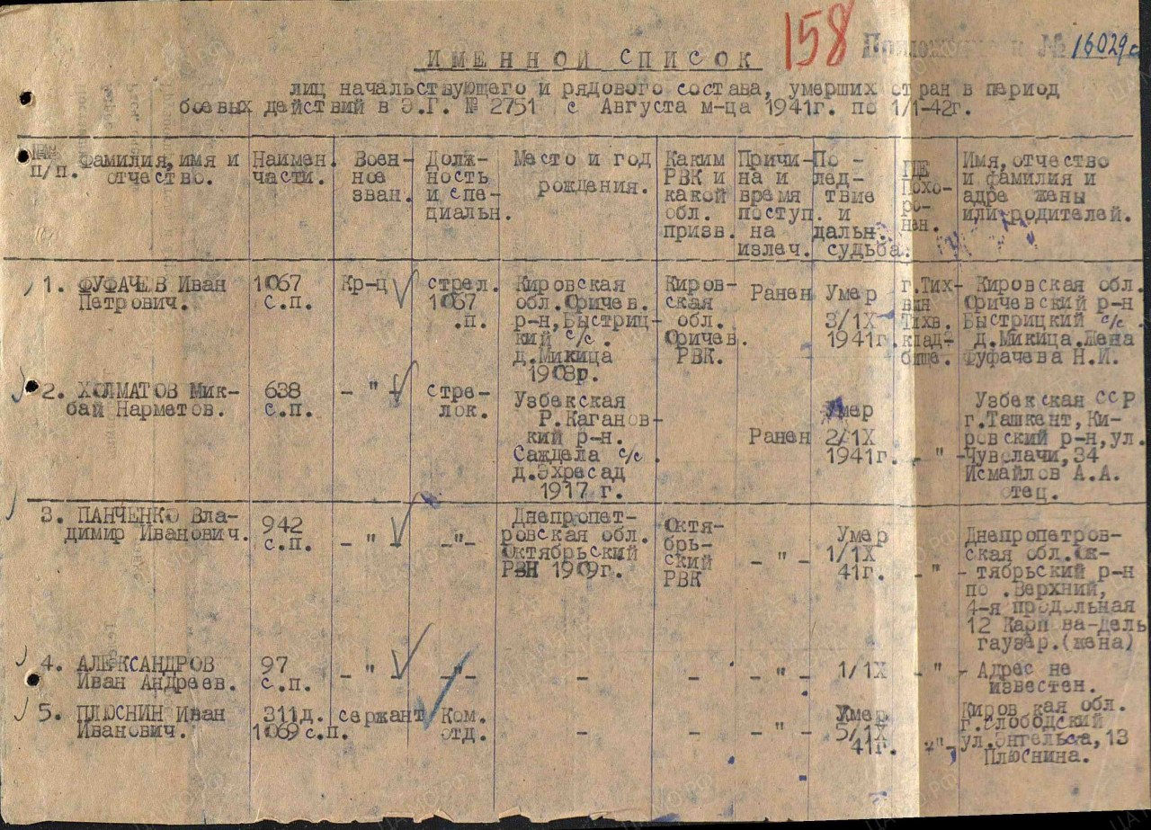 | Умер | 03.09.1941 | умер от ран в госпитале |