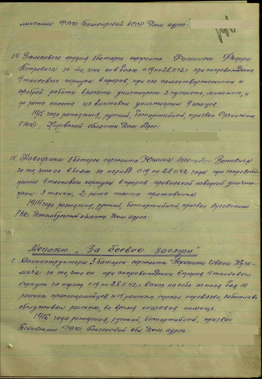 | Награждён: Медаль «За отвагу» | 15.12.1942 | Приказ № 3 по 1180 иптап РГК | |