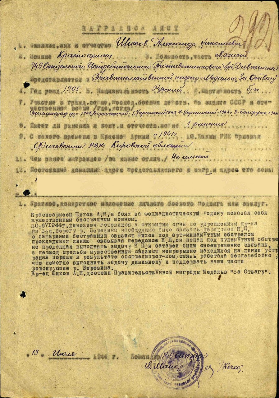 Шихов Александр Николаевич, 1905 г.р., из д. Перевоз Быстрицкого с/с Оричевского района Кировской области. Мобилизован 18.07.1941 г. Оричевским РВК в 689 сп. Фактически: красноармеец, 2-го батальона, 1067 сп 311 сд (принял присягу 24.07.1941 г. в г. Кирове). Ранен. Выбыл из ЭГ 2020 17.09.1941 в ВСП 1016. Красноармеец, 901 сп, 245 сд (из именного списка части). Красноармеец, связист, 749 отдельный истребительный противотанковый дивизион 3 гв. тк. Награды: медаль "За отвагу". Вернулся с войны. Умер в 1980 г.