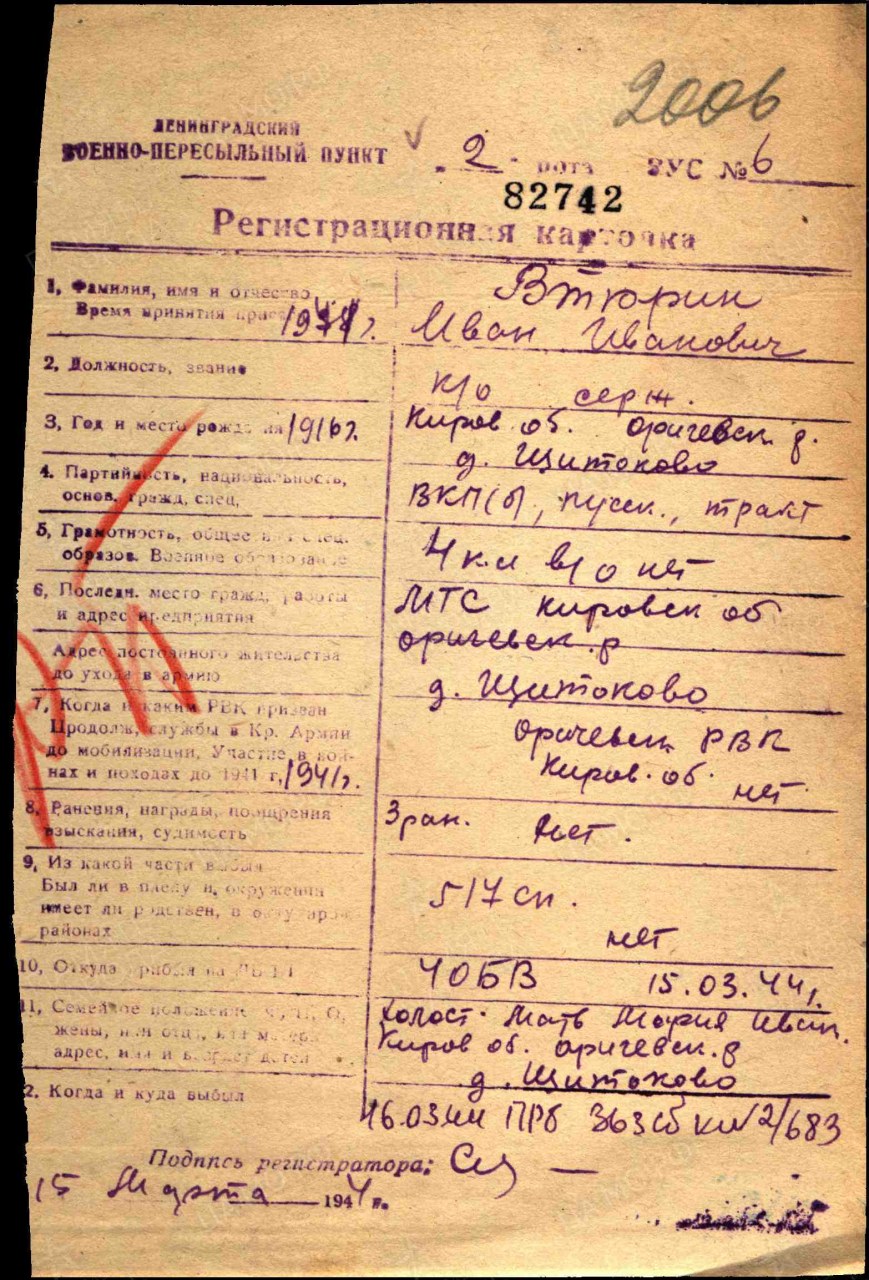 (Источники информации: Алфавитная книга призванных по мобилизации в период Великой Отечественной войны Оричевским РВК Кировской области на «В» листы 3 об, 4, № 48; ЦАМО. Фонд: Волховский ВПП. Опись: 530771. Дело: 43396; Фонд: 8540. Опись: 453618. Дело: 33; Фонд: 33. Опись: 686044, 690306. Дело: 2747, 3060; Фонд: Ленинградский ВПП. Опись: 530167. Дело: 42804: Фонд: 6608. Опись: 342117с. Дело: 3; Фонд: 58. Опись: А-71693, 18002. Дело: 2501, 1223; Филиал ЦАМО (Архив военно-медицинских документов). Фонд: Картотека ранений. Номер шкафа: Ленинградская картотека. Госпиталь 2222. Номер ящика: 275-36; Номер шкафа: Ленинградская картотека. 1941-1942 гг. Номер ящика: 252-04).
