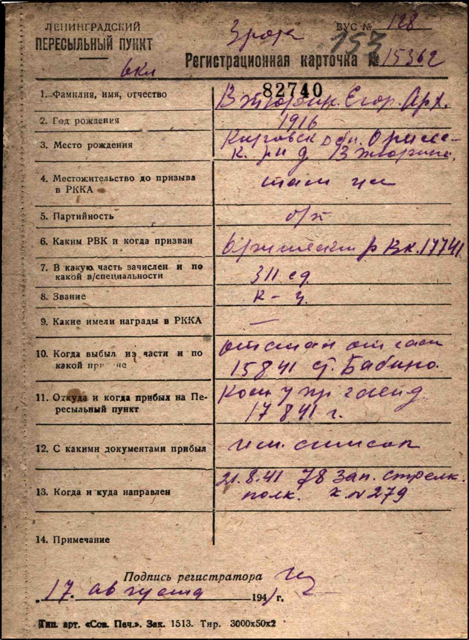 (Источники информации: Алфавитная книга призванных по мобилизации в период Великой Отечественной войны Оричевским РВК Кировской области на «В» листы 5 об, 6, № 76; ЦАМО. Фонд: 58. Опись: 977522. Дело: 227; Фонд: Ленинградский ВПП. Опись: 530167. Дело: 42804)