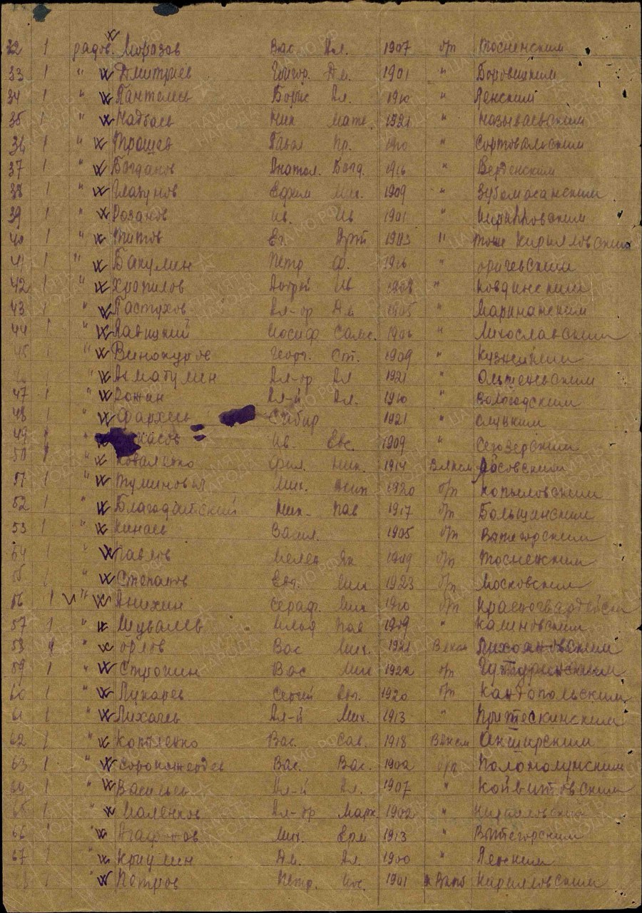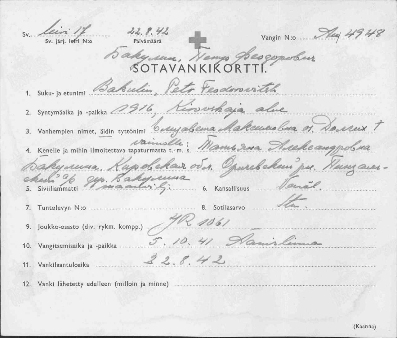Бакулин Пётр Фёдорович, 1916 г.р., из д. Бакулины Пищальского с/с Оричевского района Кировской области. Мобилизован 18.07.1941 г. Оричевским РВК в 689 сп. Фактически: красноармеец, 1067 сп 311 сд. Ранен. Выбыл не ранее 22.08.1941 г. из СЭГ 1170 в ВСП 305. 01.09.1941 г. из СЭГ 1170 в БВ. ЭГ 442. Рядовой, 34 зсп (до 29.09.1941 г.). выбыл с командой 2907. 1061 сп. Попал в плен 05.10.1941 г. Место пленения: Яанислинна. Лагерь: Лагерь № 17, Олонец. Лагерный номер: Au-4948. Репатриант. Во время ВОВ находился в плену у немцев. Освобожден англо-американскими войсками. Награды: Орден Отечественной войны II степени (1985 г.).