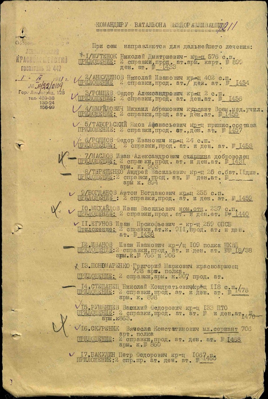 (Источники информации: Алфавитная книга призванных по мобилизации в период Великой Отечественной войны Оричевским РВК Кировской области на «Б» листы 2 об, 3, № 26; ЦАМО. Фонд: 8312. Опись: 301963. Дело: 2, 16; Юбилейная картотека награждений. Расположение документа: шкаф 2, ящик 30; Филиал ЦАМО (Архив военно-медицинских документов). Фонд: Картотека ранений. Номер шкафа: Ленинградская картотека. Дублирующие карточки. Номер ящика: 245-04; Номер шкафа: Ленинградская картотека. 1941-1942 гг. Номер ящика: 249-22; Национальный архив Финляндии,РГВА. Фонд: Финские лагеря советских военнопленных. Опись: Советские военнопленные 1941-1945. Дело: 2958357; архивная справка № 335 от 12.04.2022 г. МУ Управление культуры Оричевского района).