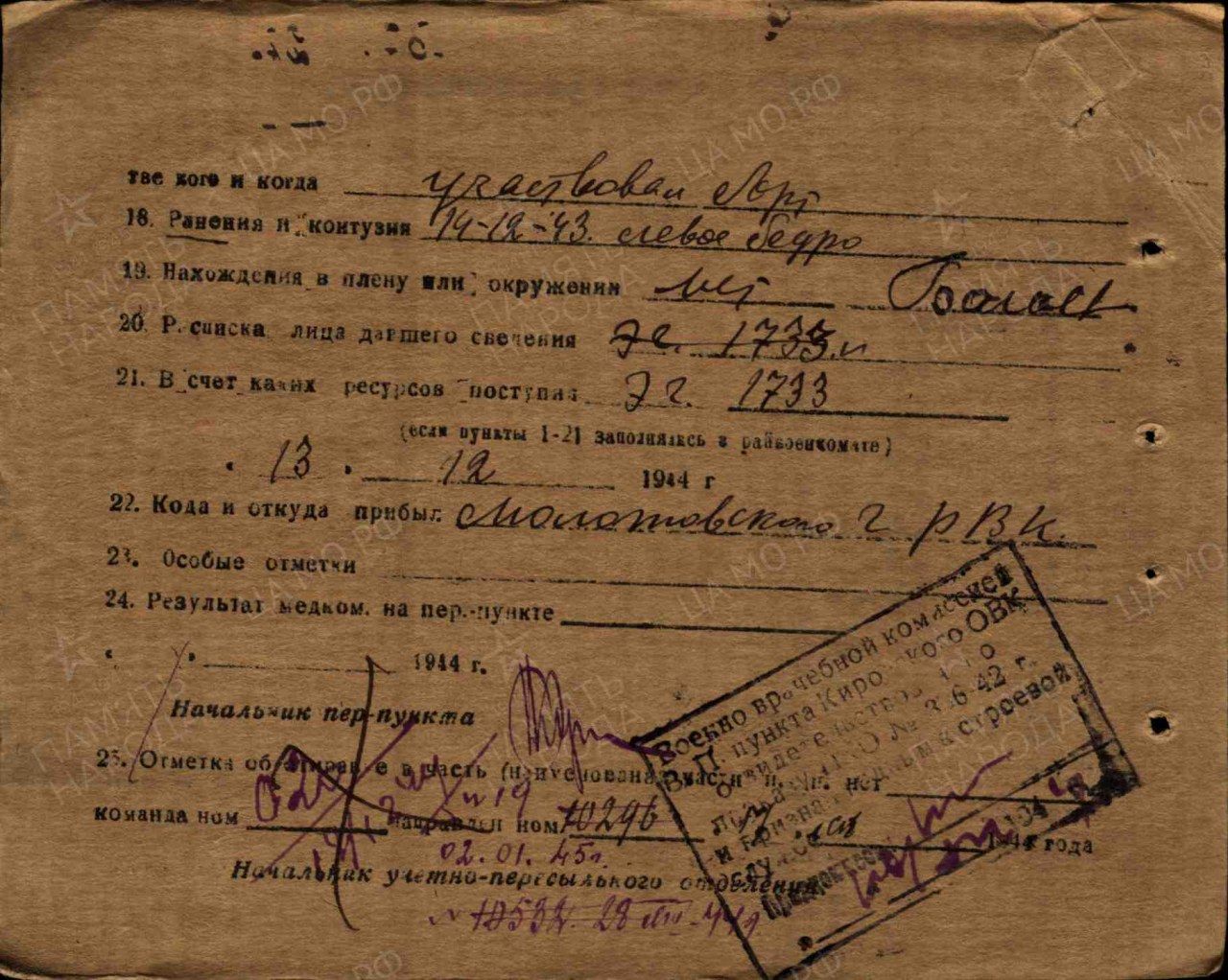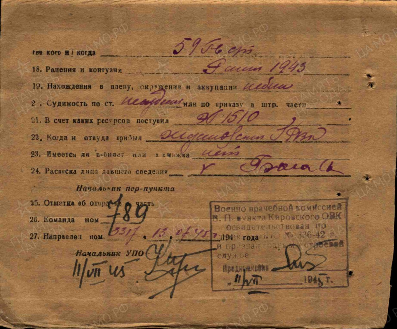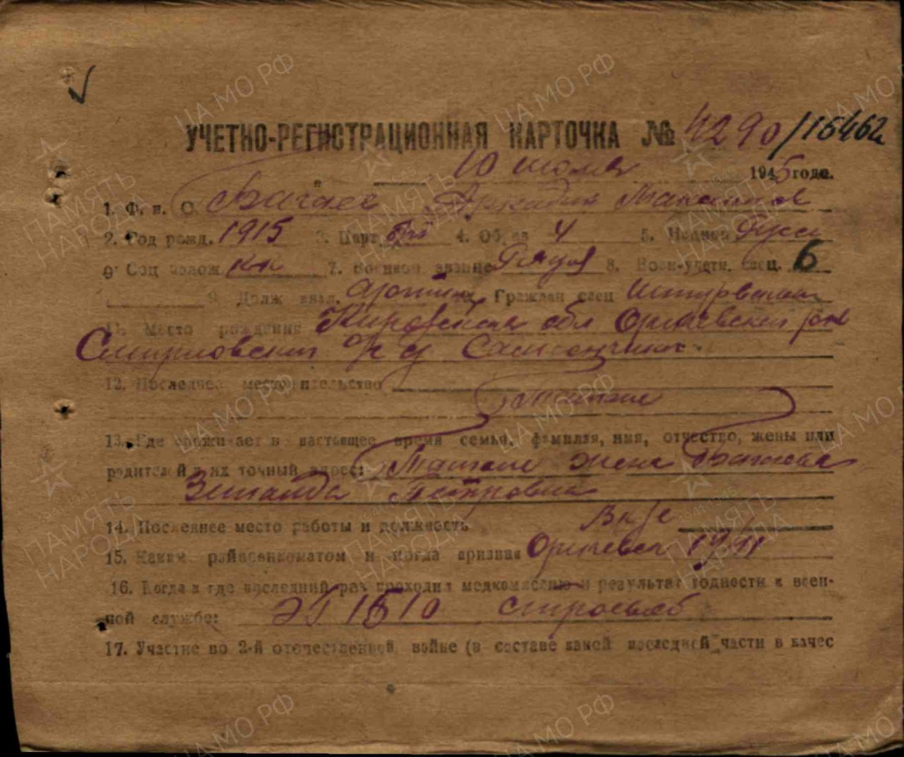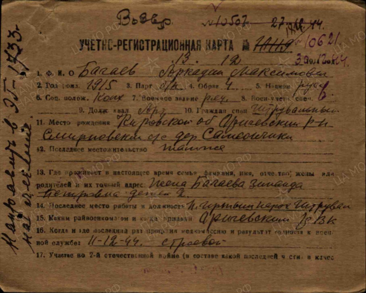 Багаев Аркадий Максимович, 1915 г.р., из д. Самсончики Смирновского с/с Оричевского района Кировской области. Мобилизован 18.07.1941 г. Оричевским РВК в 689 сп. Фактически: красноармеец, 311 сд (предполагается). Ранен. Из ЭГ 2751 эвакуирован в тыл 02.09.1941 г. Гв. красноармеец, замковой орудия 45 мм батареи, 69 гв сп (до 15.10.1942 г.), 59 гв сп (с 24.08.1942 г. по 14.12.1943 г., 04.04.- 08.12.1943 г.). Ранен 14.12.1943 г. ЭГ 1733. Вновь призван Молотовским ГРВК. Признан негодным к строевой службе 02.01.1945 г.. ЭГ 1510. Кировский ВПП 13.07.1945 г. Награды: Медаль «За отвагу», Орден Отечественной войны I степени (1985 г.).