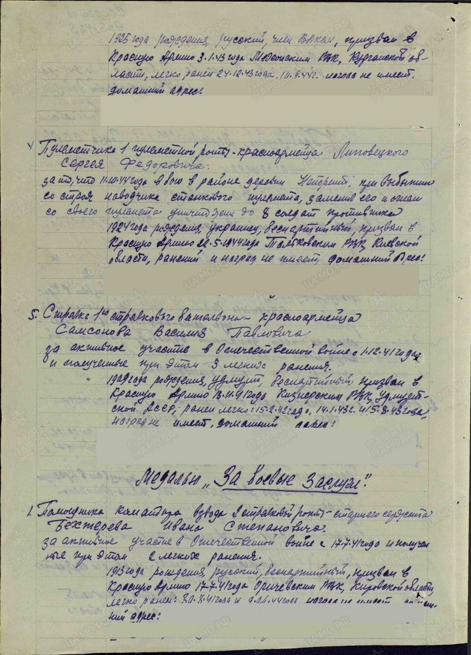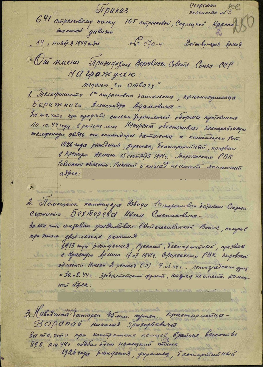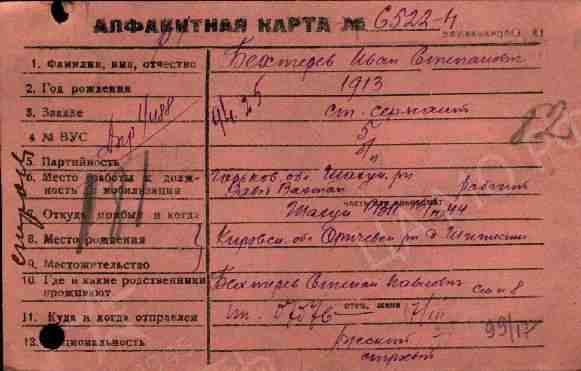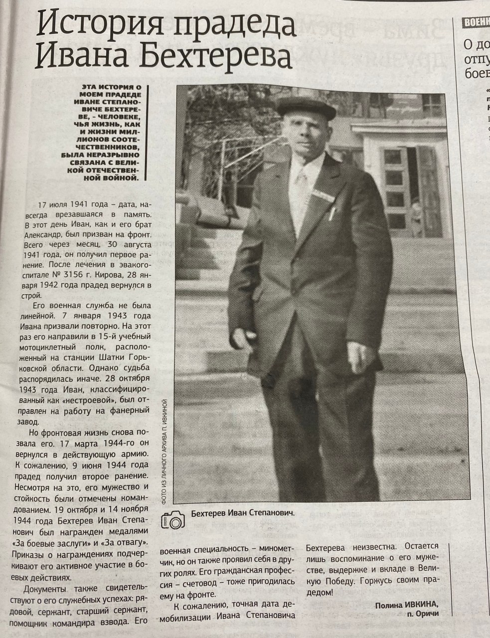 Бехтерев Иван Степанович, 1913 г.р., из д. Шишкины Спас-Талицкого с/с Оричевского района Кировской области. Мобилизован 18.07.1941 г. Оричевским РВК в 689 сп. Фактически: младший командир (ВУС-5), сержант, 1067 сп 311 сд. Ранен. 30.08.1941 г. (1067 сп) Из ЭГ 3156 выбыл 28.01.1942 г. Горьковский ВПП (17.03.1944) выбыл в п/п 07076. Ст. сержант, пом. ком. взвода, 641 сп 165 сд (на 11.1944 г.). Награды: медали «За отвагу», "За боевые заслуги".