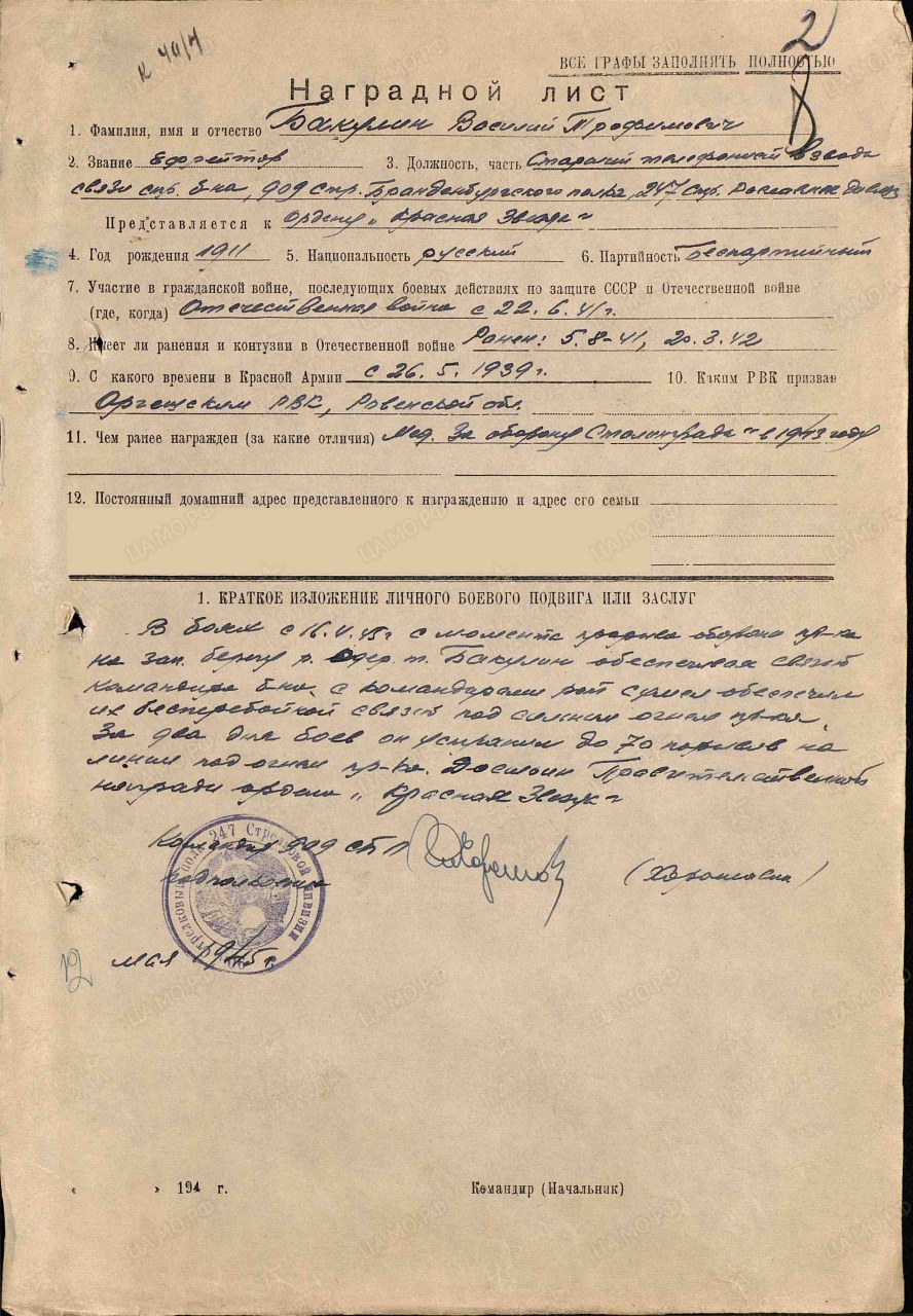 Бакулин Василий Трофимович, 1911 г.р., из д. Антоновы Быстрицкого с/с Оричевского района Кировской области. Мобилизован 18.07.1941 г. Оричевским РВК в 689 сп. Фактически: красноармеец (ВУС-45), 1067 сп 311 сд. Из СЭГ 1170 выбыл 21.08.1941 г. в ВСП 324 (1067 сп). Из ЭГ 3165 выбыл в часть 24.12.1941 г. 1228 сап 5 мк (с 07.05.1943 г. по 12.09.1943 г.). Ранен. выбыл в ГЛР 3407. Красноармеец, мл. сержант, телефонист, ст. телефонист, взвод связи 1-го стрелкового батальона 909 сп 247 сд. Демобилизован 30.10.1945 г. Награды: медали "За оборону Сталинграда", «За отвагу», орден Красной Звезды, Орден Отечественной войны I степени (1985 г.). Умер в 1988 г.