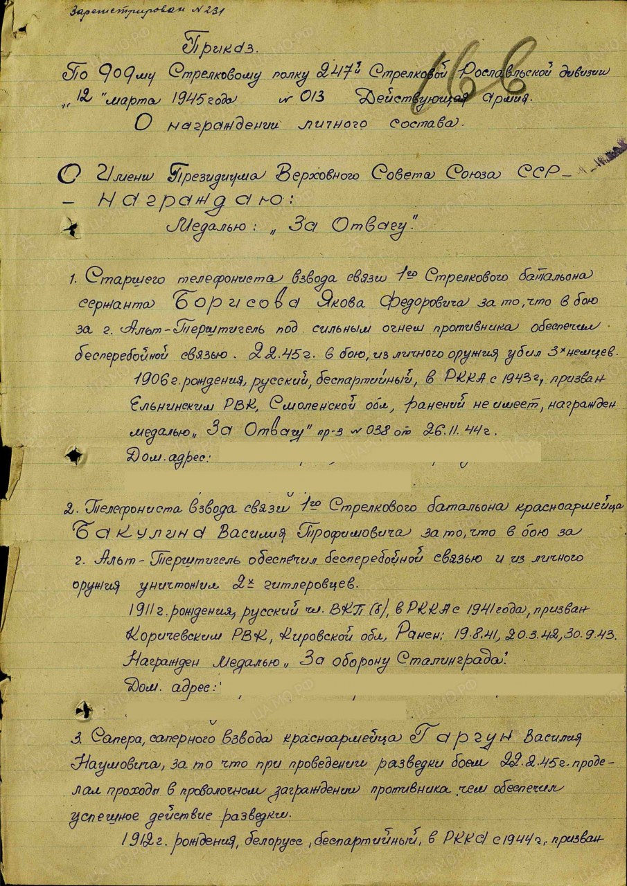 | Награждён: Медаль «За отвагу» | 12.03.1945 | Приказ № 13 по 909 сп 247 сд | |
