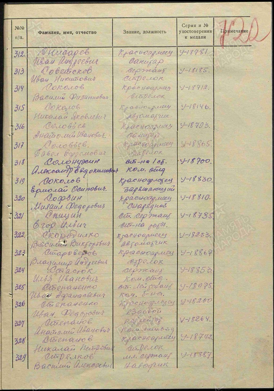 | Награждён: Медаль «За оборону Ленинграда» | 07.07.1943 | Наградной документ Воинское звание: мл. сержант Воинская часть: 406 сп Кто наградил: 406 сп 124 сд Наименование награды: Медаль «За оборону Ленинграда» Номер документа: 298/ОТЧ Дата документа: 07.07.1943 Приказ подразделения №: 298/ОТЧ от: 07.07.1943 Издан: 406 сп 124 сд Информация об архиве - Архив: ЦАМО Фонд ист. информации: 424 Опись ист. информации: 10247 Дело ист. информации: 55 | |