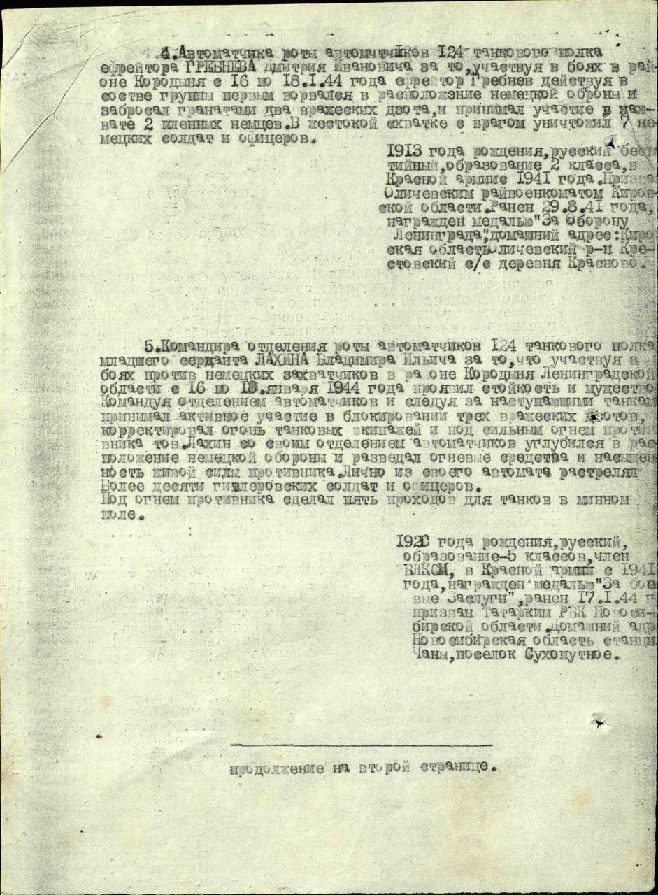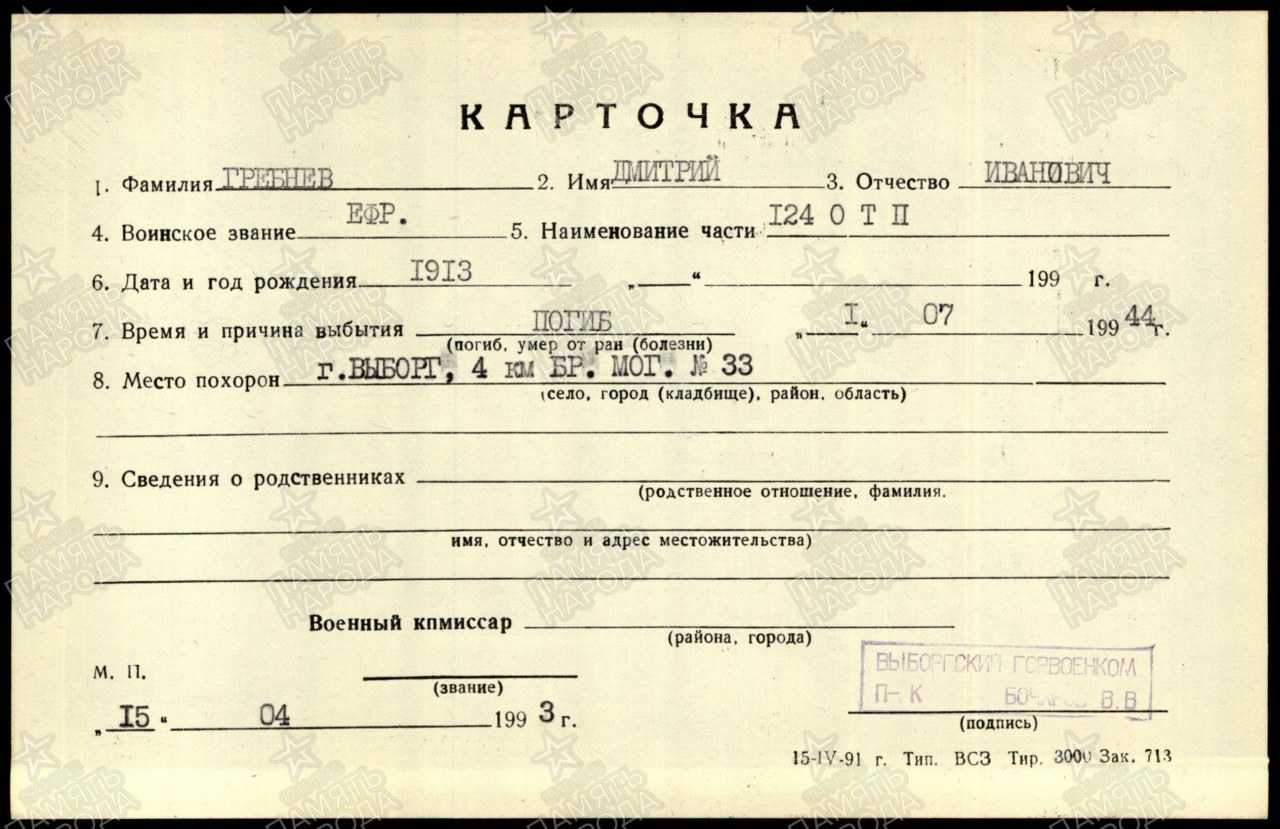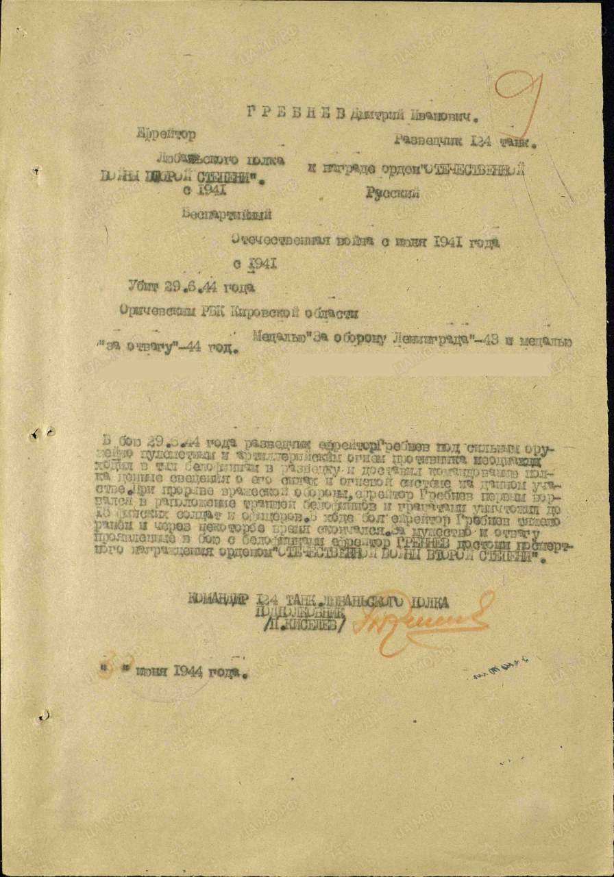 Гребенев Дмитрий Иванович, 1913 г.р., уроженец д. Бушмаки Шалеговского с/с Оричевского района Кировской области. Перед мобилизацией работал в колхозе "Красновский" Крысовского с/с и жил в д. Красново. Мобилизован 18.07.1941 г. Оричевским РВК в 689 сп. Фактически: красноармеец, 311 сд (предполагается). Попал в другую часть. Рядовой, 168 сп 70 сд. Ранен 29.08.1941 г. Выбыл из СЭГ 1170 не ранее 31.08.1941 г. в госпиталь 2763. Выбыл 13.09.1941 г. по ранению из ЭГ 2764 в ЭГ 66. ПРБ 36 зсд (16.09.41). Ефрейтор, разведчик, 124 Любанский танковый полк 124 отб. Ранен 05.10.1943 г. 318 медсб. Погиб или умер от ран 30.06.1944 г. (по донесению 124 тп) (дата колеблется). Увековечен п. Петровка Выборгский р-н мог. № 30. Награды: медали "За оборону Ленинграда", "За отвагу", орден Отечественной войны II степени (посмертно).