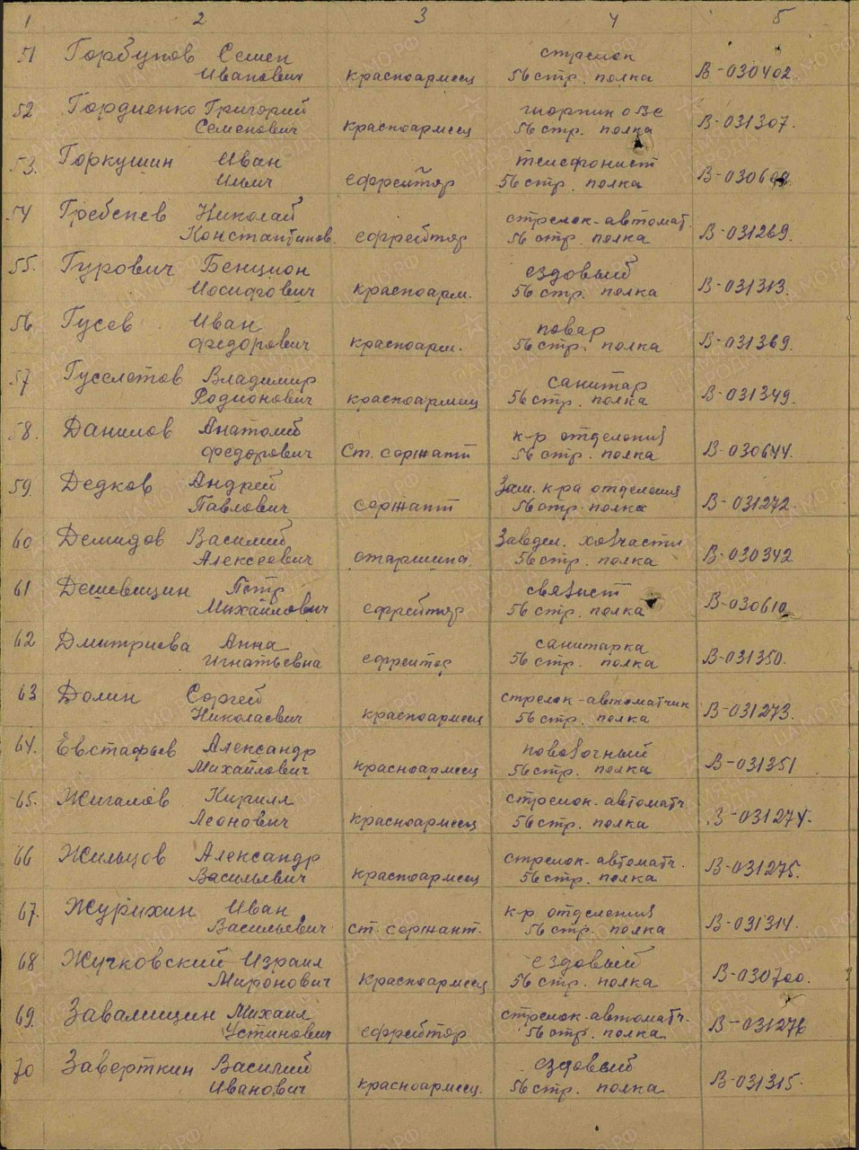 Гребенев Николай Константинович, 1910 г.р., из д. Лобошане Шалеговского с/с Оричевского района Кировской области. Мобилизован 18.07.1941 г. Оричевским РВК в 689 сп. Фактически: красноармеец, 1-й батальон, 1067 сп 311 сд (принял присягу 24.07.1941 г. в г. Кирове). Ранен. Выбыл 08.09.1941 г. из госпиталя ЭГ 2761 (1067 сп 311 сд). Из 34 зсп выбыл 14.10.1941 г. с командой 4112. Ефрейтор, стрелок-автоматчик, 56 сп 67 сд. Награды: медаль «За оборону Советского Заполярья».