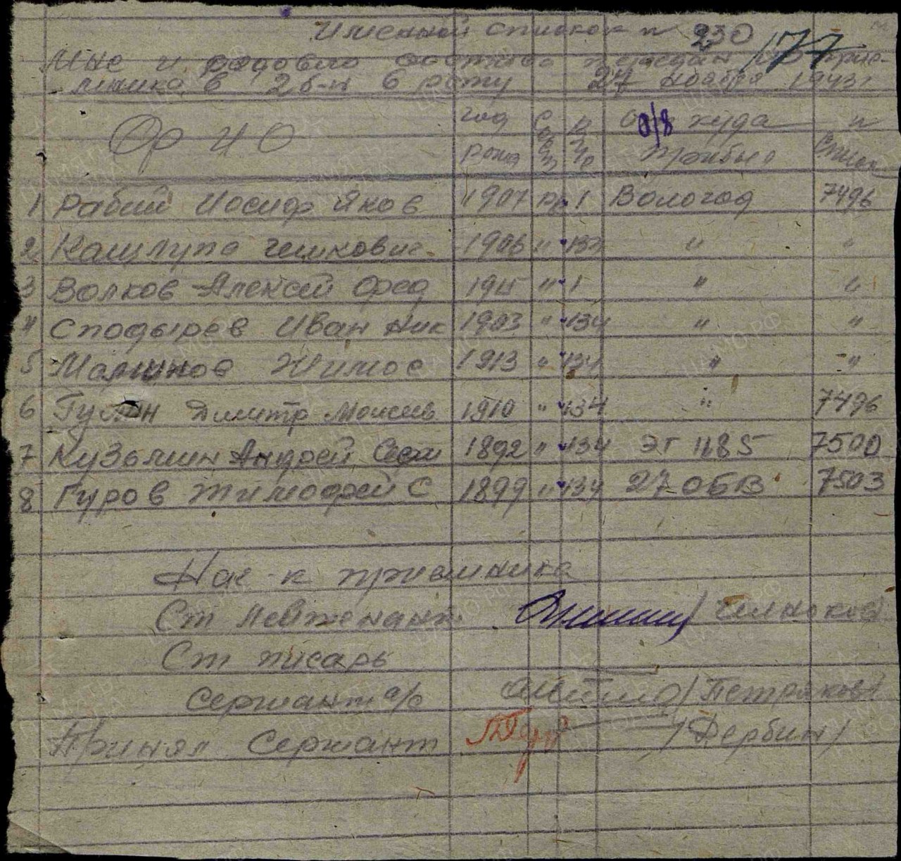 Гулин Дмитрий Моисеевич, 1910 г.р., из д. Целищевы Крысовского с/с Оричевского района Кировской области. Мобилизован 18.07.1941 г. Оричевским РВК в 689 сп. Фактически: красноармеец (ВУС-88, химик), 1067 сп 311 сд. Ранен. Выбыл 13.03.1942 г. из ЭГ 1834 (1067 сп 311 сд). Вновь призван Оричевским РВК 09.12.1943 г. Направлен в 8 запасной железнодорожный полк (г. Ярославль). Вологодский ВПП г. Вологда выбыл 27.11.1943 г. в 34 зсп.