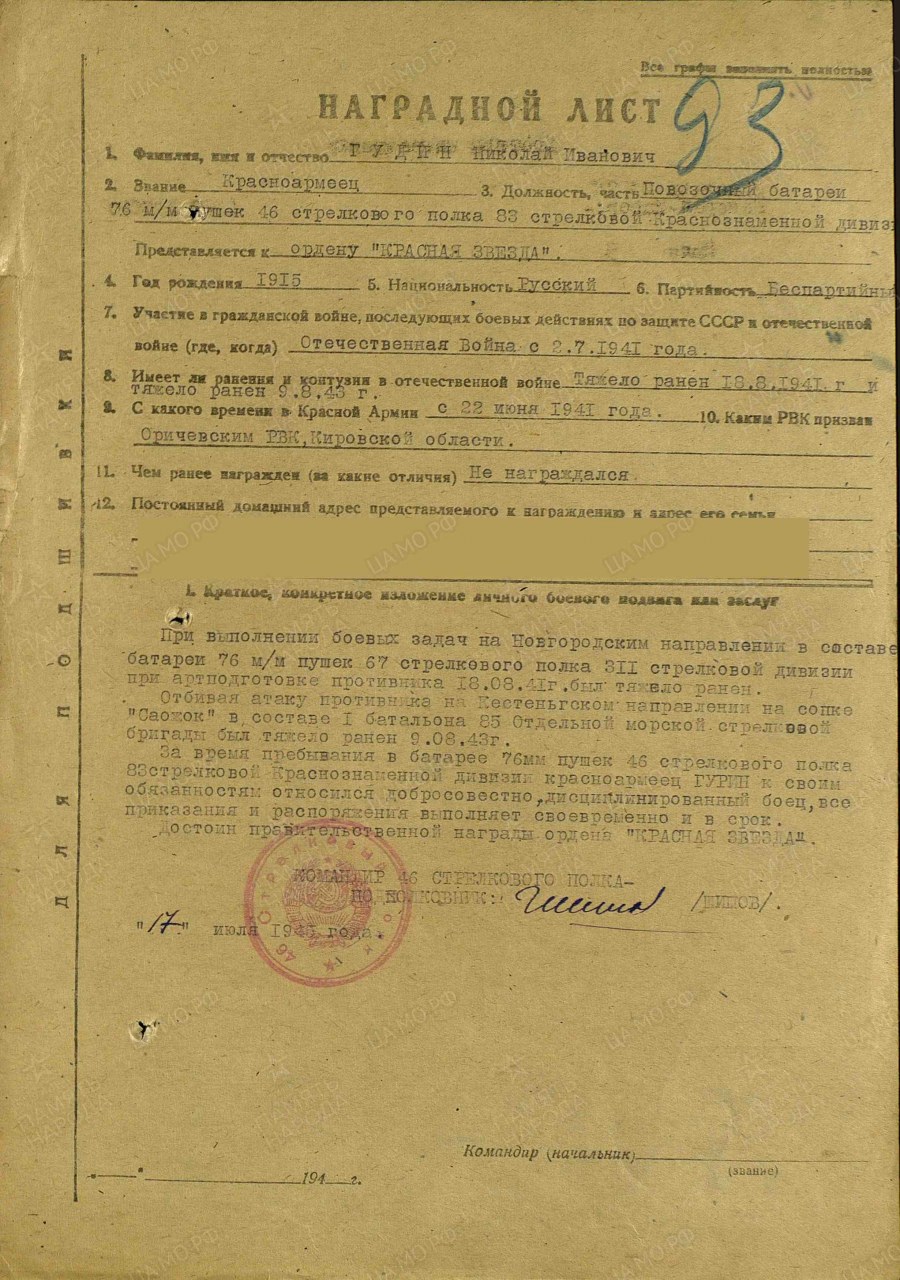 Гудин Николай Иванович, 1915 г.р., из д. Давыдово Вальковского с/с Оричевского района Кировской области. Член ВЛКСМ. Мобилизован 18.07.1941 г. Оричевским РВК в 689 сп. Фактически: красноармеец, батарея 76 мм пушек, 1067 сп 311 сд. Тяжело ранен 18.08.1941 г. Из ЭГ 3654 выбыл 01.10.1941 г. в 20 зсбр, 45 усд (г. Казань, лагерь № 1). 85 отдельная морская стрелковая бригада (до 09.08.1943 г.). Тяжело ранен 09.08.1943 г. на Кестеньгском направлнии на сопке "Саожое". Красноармеец, батарея 76 мм пушек 46 сп 83 стрелковая Краснознаменная дивизия (с 27.11.1944 г. по 08.10.1945 г.). Награды: медаль "За отвагу", орден Отечественной войны II степени (1985).