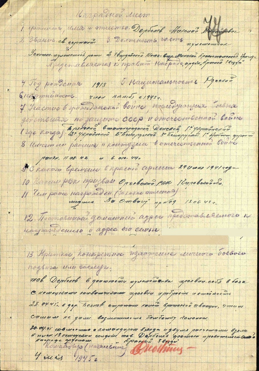 Дербенев Николай Михайлович, 1913 г.р., уроженец д. Греково Евсинского с/с Тужинского района Кировской области. Член ВКП (б) с 1943 г. До мобилизации работал на Гадовских торфоразработках Быстрицкого с/с и проживал там же. Мобилизован 18.07.1941 г. Оричевским РВК в 689 сп. Фактически: красноармеец, пулеметный взвод, 5 рота 2-го батальона, 1067 сп 311 сд (принял присягу 24.07.1941 г. в г. Кирове). Попал в 288 сд. Считался пропавшим без вести 17.10.1941 г. Ленинградская обл., Чудовский р-н, д. Остров, рядом. Фактически был ранен 17.10.1941 г. Гв. сержант, старший наводчик роты противотанковых ружей, пулеметчик зенитно-пулеметной роты, 2 Гв. мсбр. Награды: медали «За оборону Сталинграда» "За отвагу", орден Красной Звезды.
