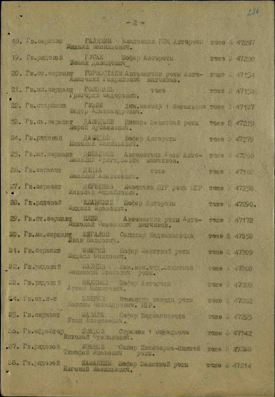 | Награждён: Медаль «За отвагу» | 13.06.1943 | Приказ № 9 по 2 гв. мсбр | |