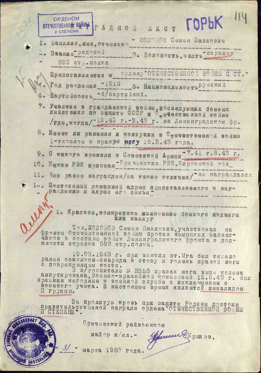 Жолобов Семён Павлович, 1916 г.р., из д. Жолобовы Пустошенского с/с Оричевского района. Мобилизован Орическим РВК 18.07.1941 г. в 689 сп. Фактически: красноармеец, 1067 сп 311 сд (предполагается). Красноармеец, 593 сп 131 сд. Тяжело ранен 19.03.1943 г. Выбыл 13.04.1943 г. из СЭГ 2222 в ЭГ 2763. Эвакуирован в тыл 30.05.1943 г. Комиссией ЭГ 3353 признан негодным к военной службе 12.08.1943 г. Инвалид войны. Награды: Орден Отечественной войны II степени (1951 г.).