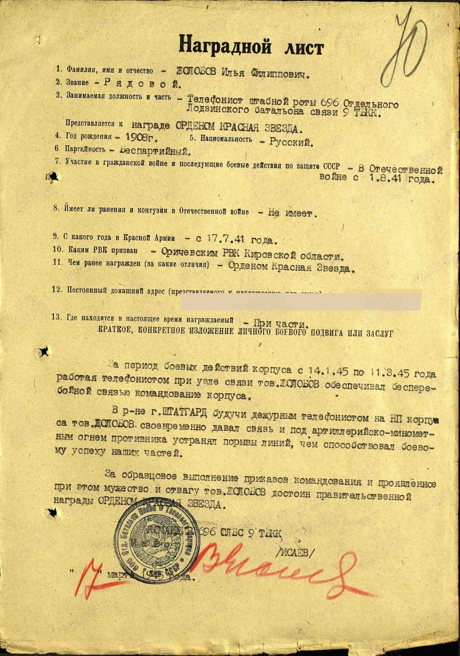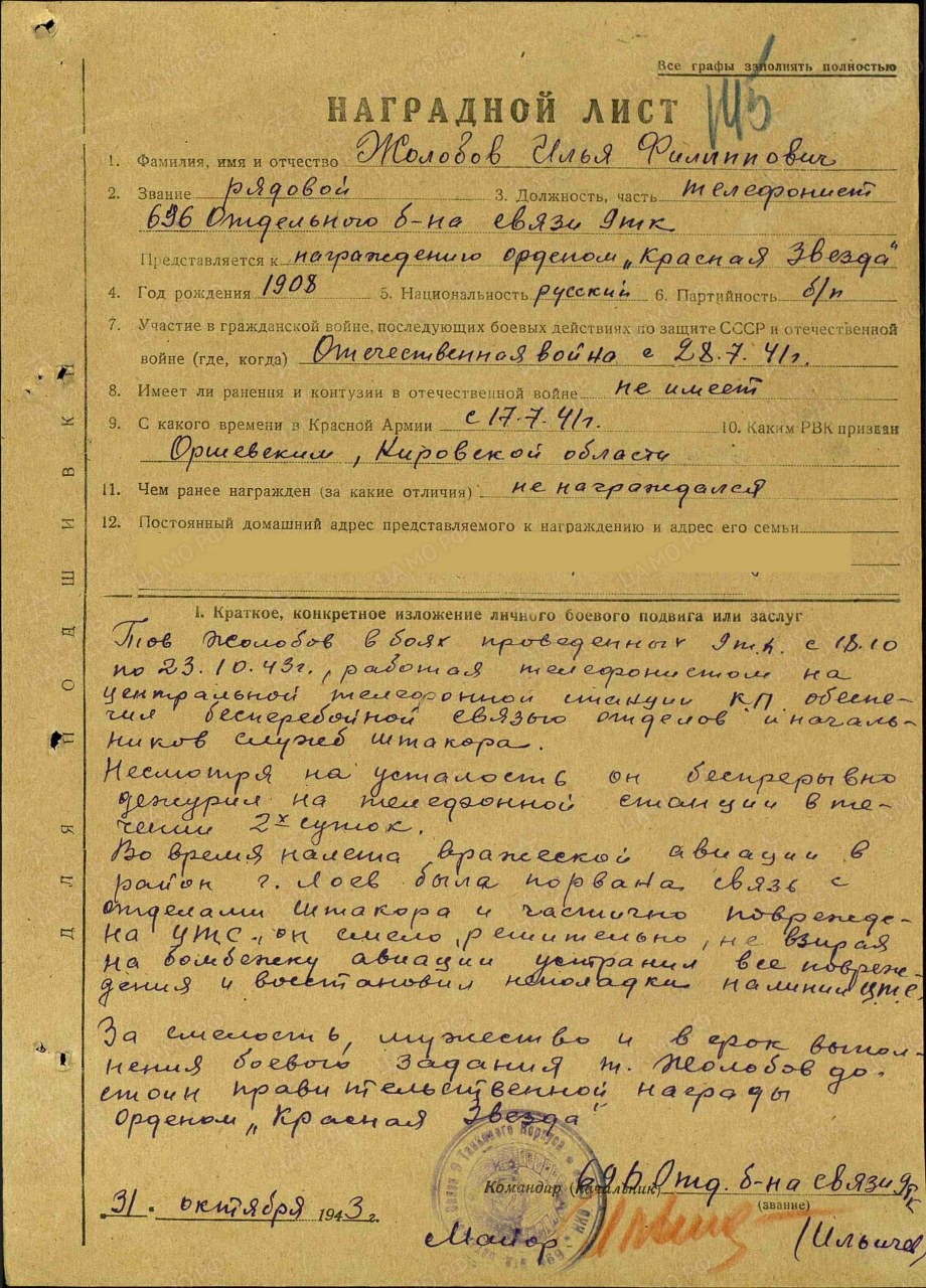 Жолобов Илья Филиппович, 1908 г.р., из д. Пустая Чуркинского с/с Оричевского района. Мобилизован Орическим РВК 18.07.1941 г. в 689 сп. Фактически: младший командир, 311 сд. Ранен. 23.09.1941 г. выбыл в часть/госпиталь ЭГ 3675 (311 сп). Красноармеец, рядовой, телефонист, 696 обс 9 танковый корпус (с 07.09.1943 г.). Награды: орден Красной Звезды (два), медаль "За боевые заслуги", орден Отечественной войны II степени (1985 г.).